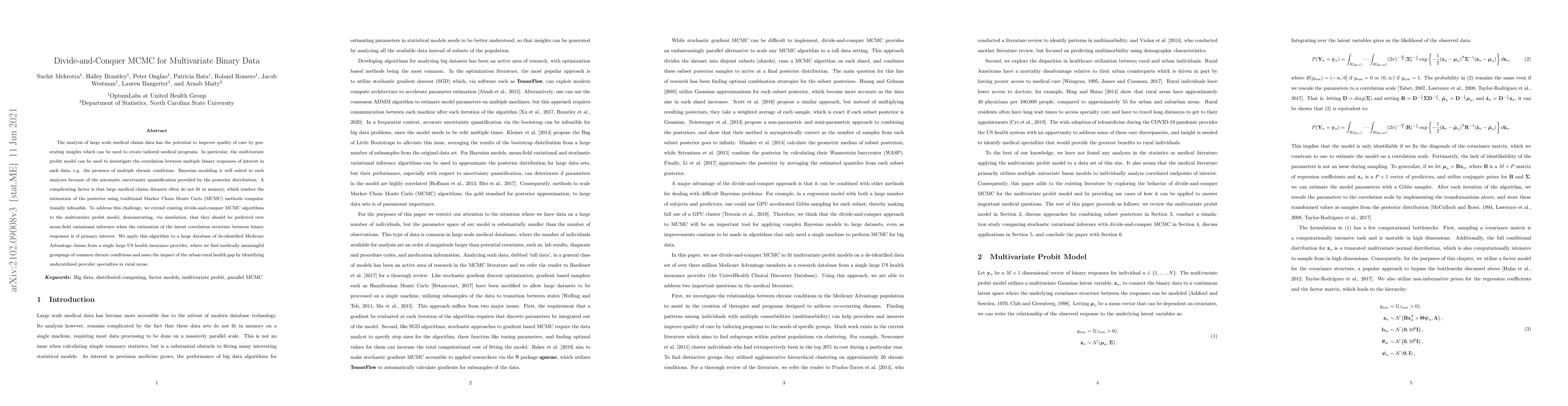 This paper proposes a divide-and-conquer MCMC method for estimating the posterior in multivariate probit models applied to large-scale medical claims data. The method is shown to outperform mean-field variational inference, especially for estimating latent correlations between binary responses, and is demonstrated using a large Medicare database to identify chronic condition groupings and rural health disparities.