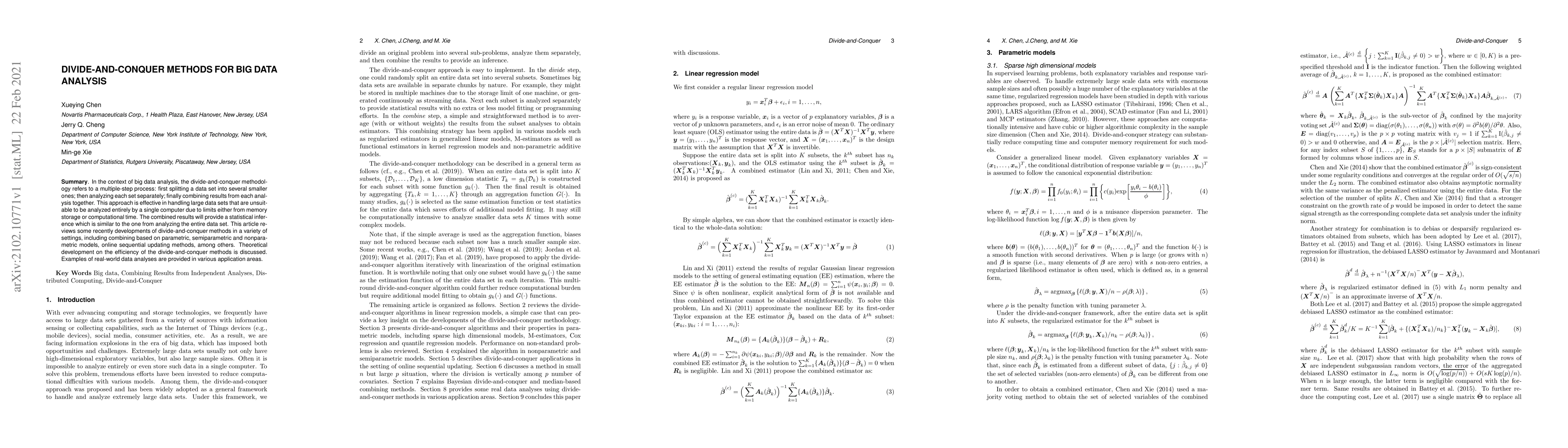 This paper reviews recent advancements in divide-and-conquer methods for big data analysis, emphasizing their effectiveness in managing large datasets by splitting, analyzing, and combining results. It covers developments in parametric, semiparametric, and nonparametric models, as well as online sequential updating techniques, and discusses their theoretical efficiency.