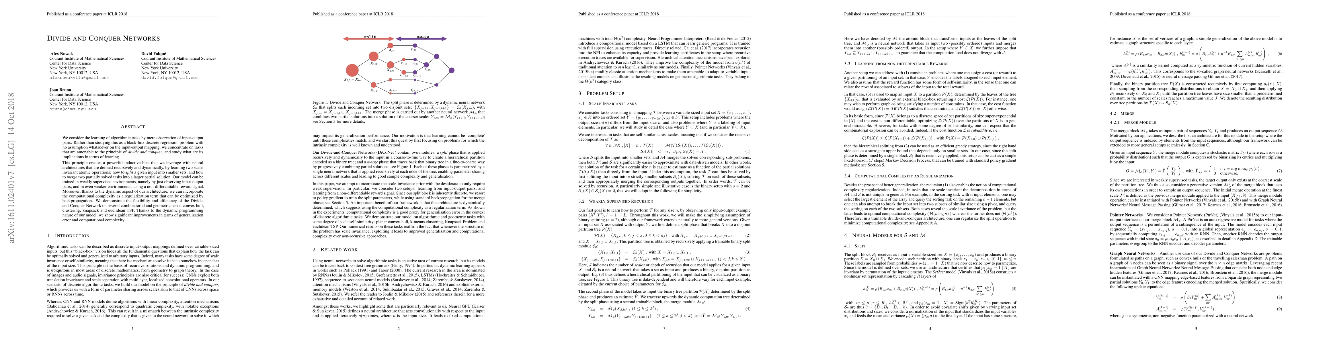 This paper introduces Divide-and-Conquer Networks, which leverage the divide-and-conquer principle to learn algorithmic tasks from input-output pairs, employing neural architectures defined recursively. These networks achieve efficiency and flexibility in solving combinatorial and geometric problems with reduced generalization error and improved computational complexity.
