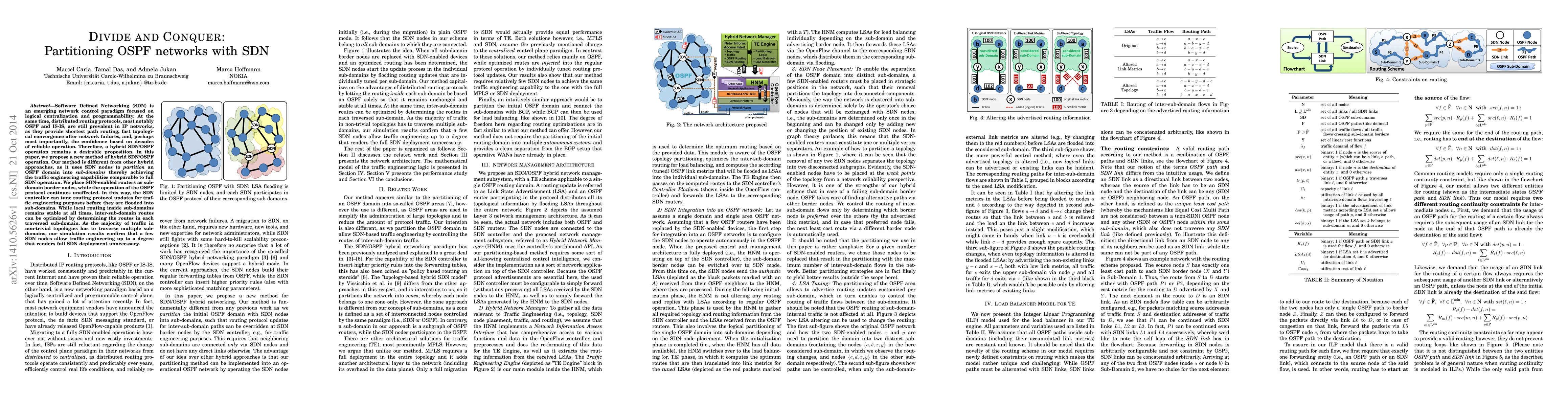 This paper proposes a hybrid SDN/OSPF method where SDN nodes partition an OSPF domain into sub-domains, optimizing traffic engineering while maintaining OSPF's stability. The SDN controller can selectively optimize inter-sub-domain routes, achieving significant traffic engineering benefits without requiring a full SDN deployment.