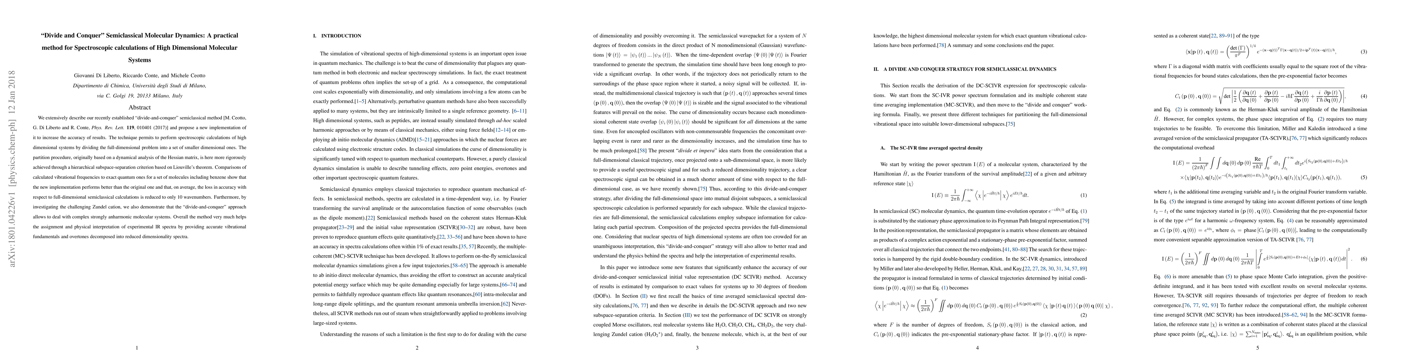 The "divide-and-conquer" semiclassical molecular dynamics method is refined to enhance accuracy for spectroscopic calculations of high-dimensional systems, achieving a loss in accuracy of only 10 wavenumbers compared to full-dimensional calculations, and effectively handling complex anharmonic systems like the Zundel cation.