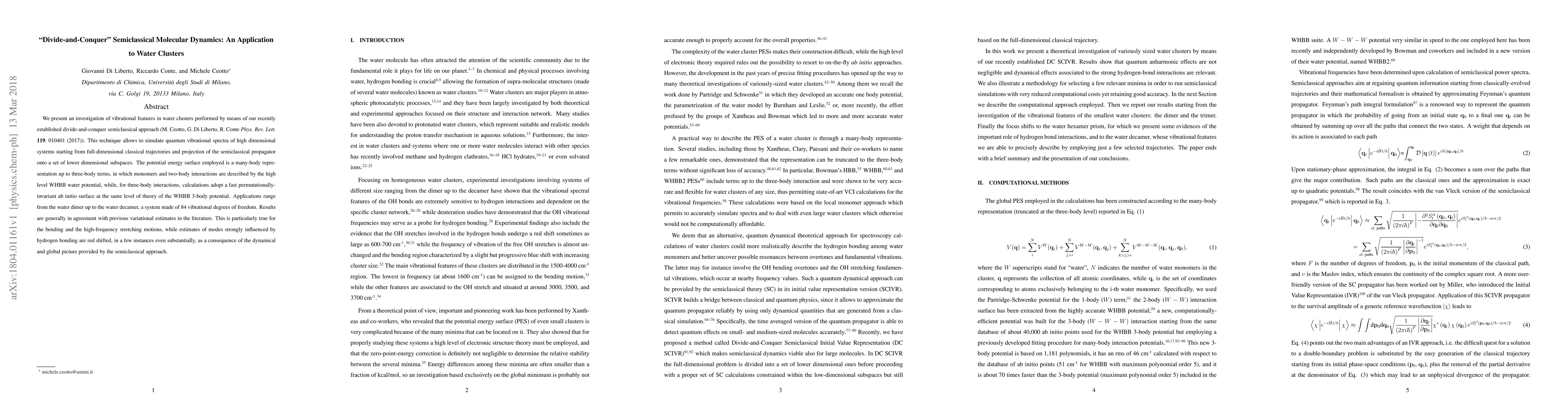 This paper applies a divide-and-conquer semiclassical approach to simulate quantum vibrational spectra in water clusters, ranging from dimers to decamers. The method projects semiclassical propagators from full-dimensional classical trajectories onto lower dimensional subspaces, yielding results generally in agreement with previous estimates, though with notable red shifts in modes strongly influenced by hydrogen bonding.