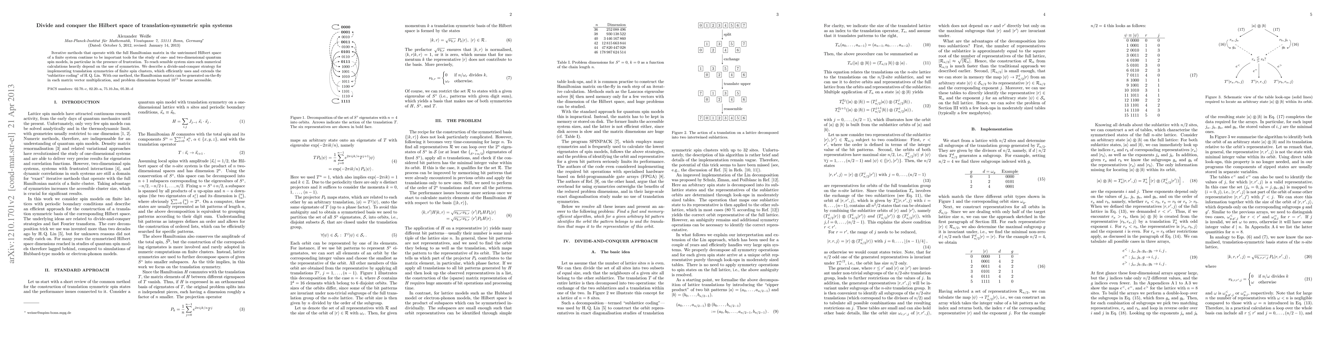 Iterative methods that operate with the full Hamiltonian matrix in the untrimmed Hilbert space of a finite system continue to be important tools for the study of one- and two-dimensional quantum spin models, in particular in the presence of frustration. To reach sensible system sizes such numerical calculations heavily depend on the use of symmetries. We describe a divide-and-conquer strategy for implementing translation symmetries of finite spin clusters, which efficiently uses and extends the "sublattice coding" of H. Q. Lin. With our method, the Hamiltonian matrix can be generated on-the-fly in each matrix vector multiplication, and problem dimensions beyond 10^11 become accessible.