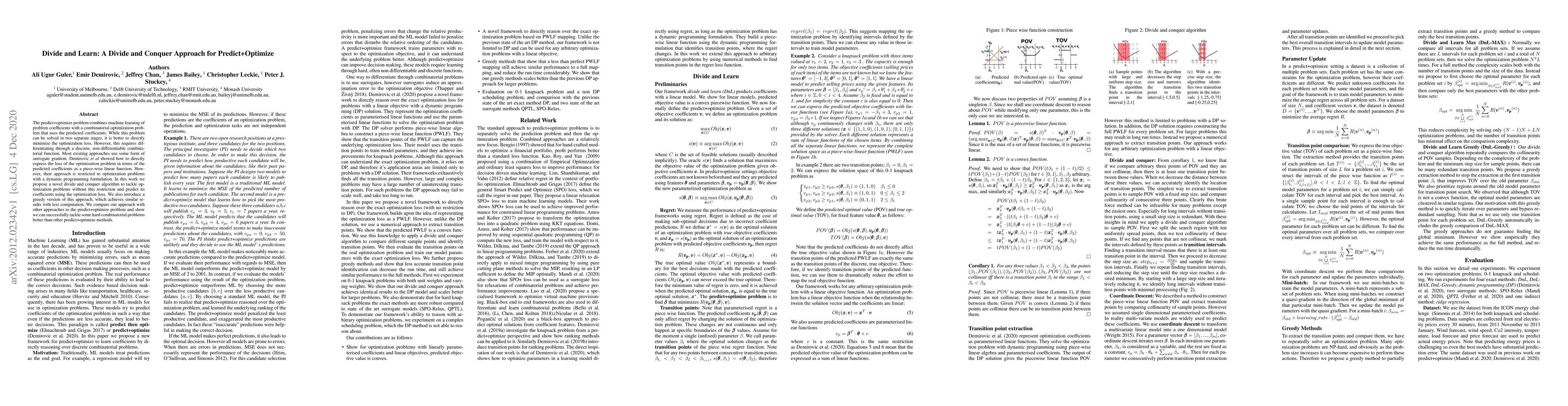 The predict+optimize problem combines machine learning ofproblem coefficients with a combinatorial optimization prob-lem that uses the predicted coefficients. While this problemcan be solved in two separate stages, it is better to directlyminimize the optimization loss. However, this requires dif-ferentiating through a discrete, non-differentiable combina-torial function. Most existing approaches use some form ofsurrogate gradient. Demirovicet alshowed how to directlyexpress the loss of the optimization problem in terms of thepredicted coefficients as a piece-wise linear function. How-ever, their approach is restricted to optimization problemswith a dynamic programming formulation. In this work wepropose a novel divide and conquer algorithm to tackle op-timization problems without this restriction and predict itscoefficients using the optimization loss. We also introduce agreedy version of this approach, which achieves similar re-sults with less computation. We compare our approach withother approaches to the predict+optimize problem and showwe can successfully tackle some hard combinatorial problemsbetter than other predict+optimize methods.