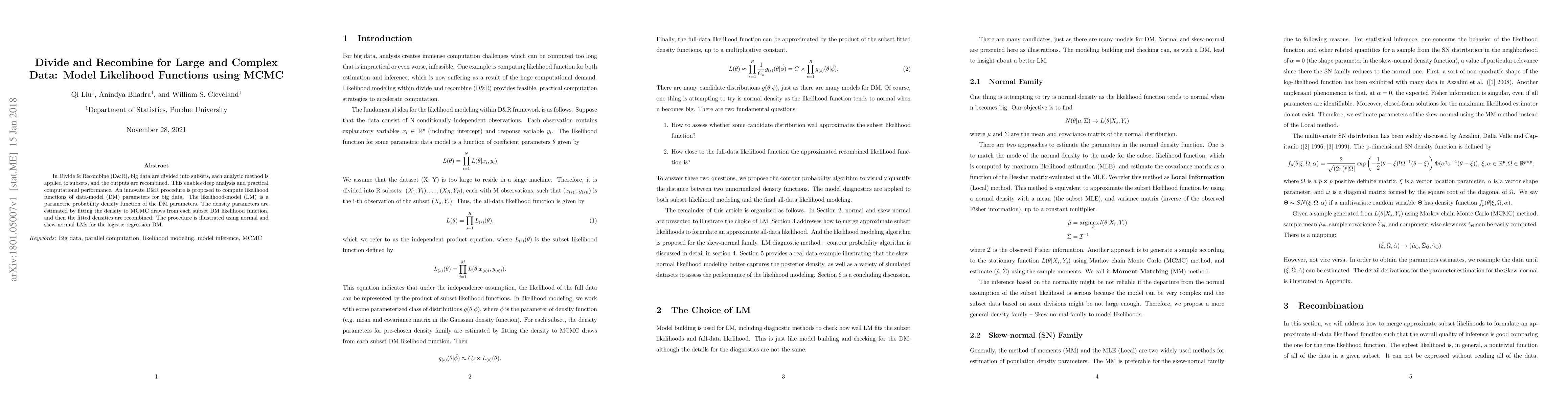 In Divide & Recombine (D&R), big data are divided into subsets, each analytic method is applied to subsets, and the outputs are recombined. This enables deep analysis and practical computational performance. An innovate D\&R procedure is proposed to compute likelihood functions of data-model (DM) parameters for big data. The likelihood-model (LM) is a parametric probability density function of the DM parameters. The density parameters are estimated by fitting the density to MCMC draws from each subset DM likelihood function, and then the fitted densities are recombined. The procedure is illustrated using normal and skew-normal LMs for the logistic regression DM.
