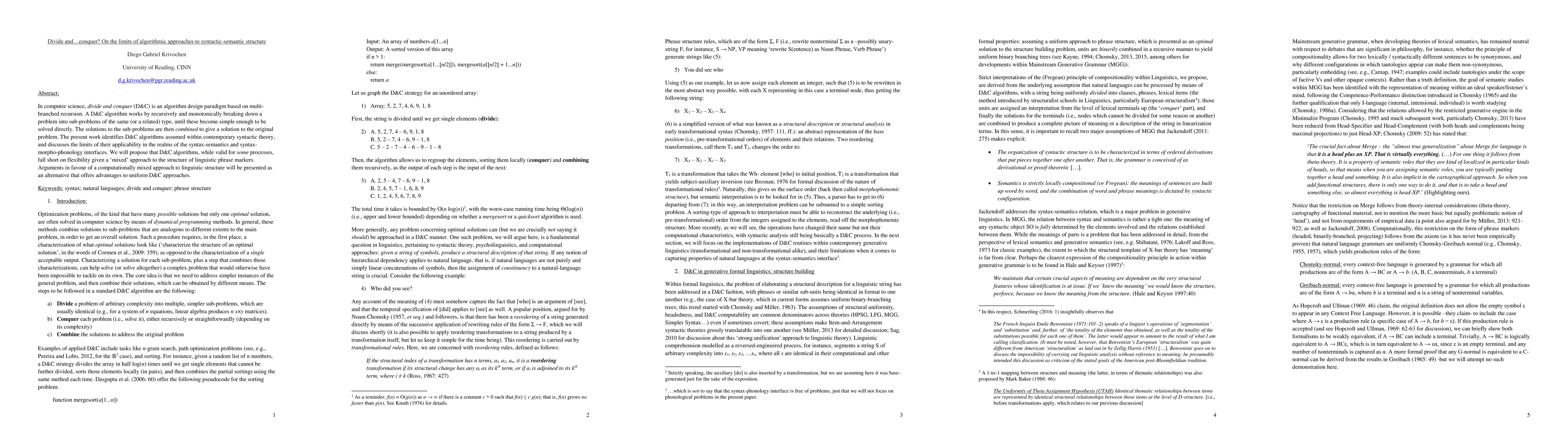 This paper examines the divide and conquer (D&C) algorithmic paradigm in syntactic theory, highlighting its limitations in addressing the syntax-semantics and syntax-morphophonology interfaces. It argues for a mixed computational approach over uniform D&C methods to better handle the complexity of linguistic phrase structures.