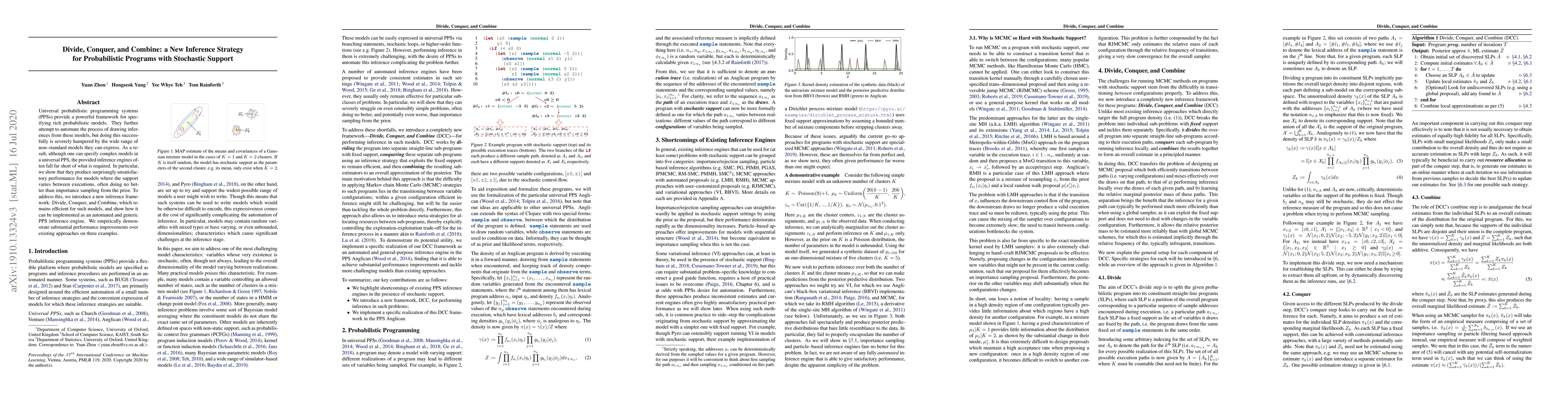 Universal probabilistic programming systems (PPSs) provide a powerful framework for specifying rich probabilistic models. They further attempt to automate the process of drawing inferences from these models, but doing this successfully is severely hampered by the wide range of non--standard models they can express. As a result, although one can specify complex models in a universal PPS, the provided inference engines often fall far short of what is required. In particular, we show that they produce surprisingly unsatisfactory performance for models where the support varies between executions, often doing no better than importance sampling from the prior. To address this, we introduce a new inference framework: Divide, Conquer, and Combine, which remains efficient for such models, and show how it can be implemented as an automated and generic PPS inference engine. We empirically demonstrate substantial performance improvements over existing approaches on three examples.