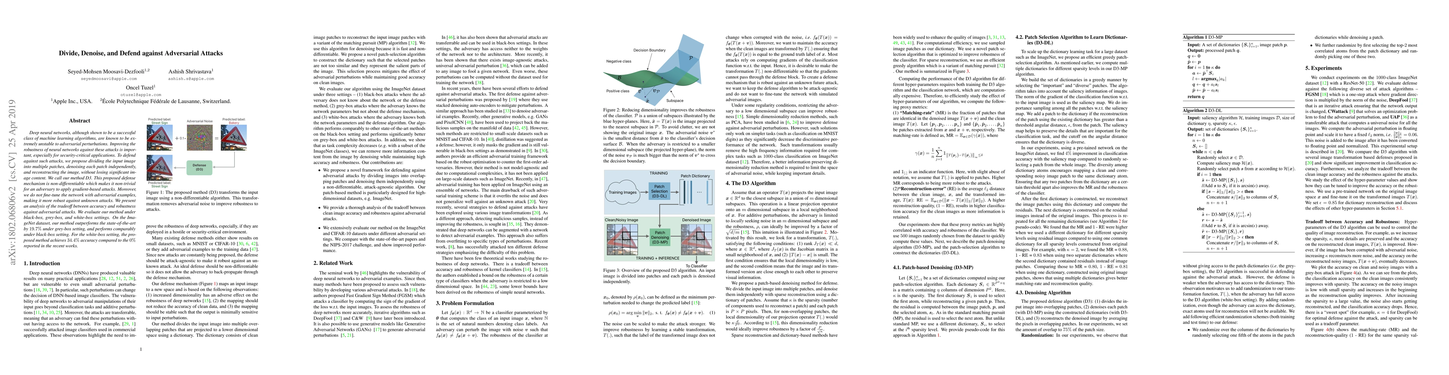This paper proposes a defense method called D3 to enhance neural network robustness against adversarial attacks by dividing images into patches, denoising them independently, and reconstructing the image. The non-differentiable nature of D3 makes it resistant to gradient-based attacks, and it outperforms state-of-the-art methods in various attack settings on ImageNet.