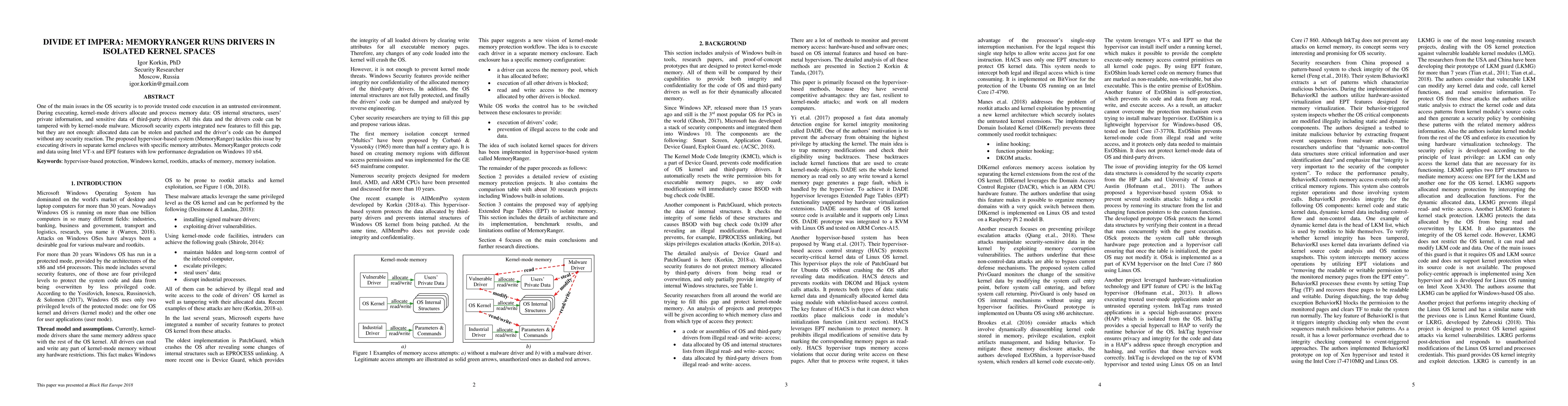 One of the main issues in the OS security is to provide trusted code execution in an untrusted environment. During executing, kernel-mode drivers allocate and process memory data: OS internal structures, users private information, and sensitive data of third-party drivers. All this data and the drivers code can be tampered with by kernel-mode malware. Microsoft security experts integrated new features to fill this gap, but they are not enough: allocated data can be stolen and patched and the drivers code can be dumped without any security reaction. The proposed hypervisor-based system (MemoryRanger) tackles this issue by executing drivers in separate kernel enclaves with specific memory attributes. MemoryRanger protects code and data using Intel VT-x and EPT features with low performance degradation on Windows 10 x64.