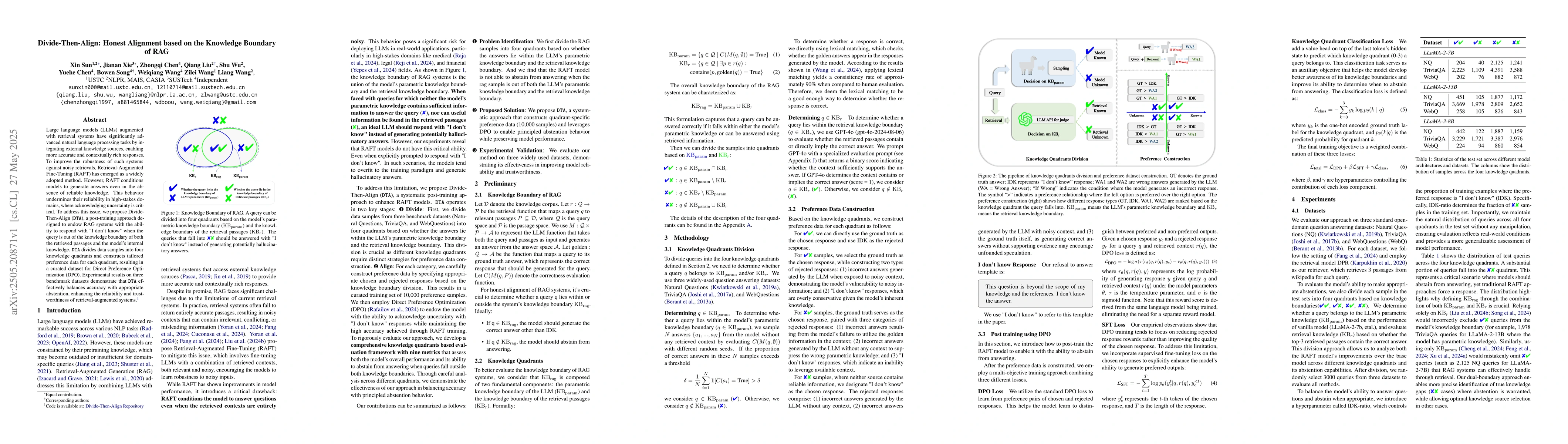 The research proposes Divide-Then-Align (DTA), a post-training approach for RAG systems that enables them to respond with 'I don't know' when queries fall outside the knowledge boundary of both retrieved passages and the model's internal knowledge. DTA divides data samples into four quadrants and constructs tailored preference data for each, resulting in a curated dataset for Direct Preference Optimization (DPO).