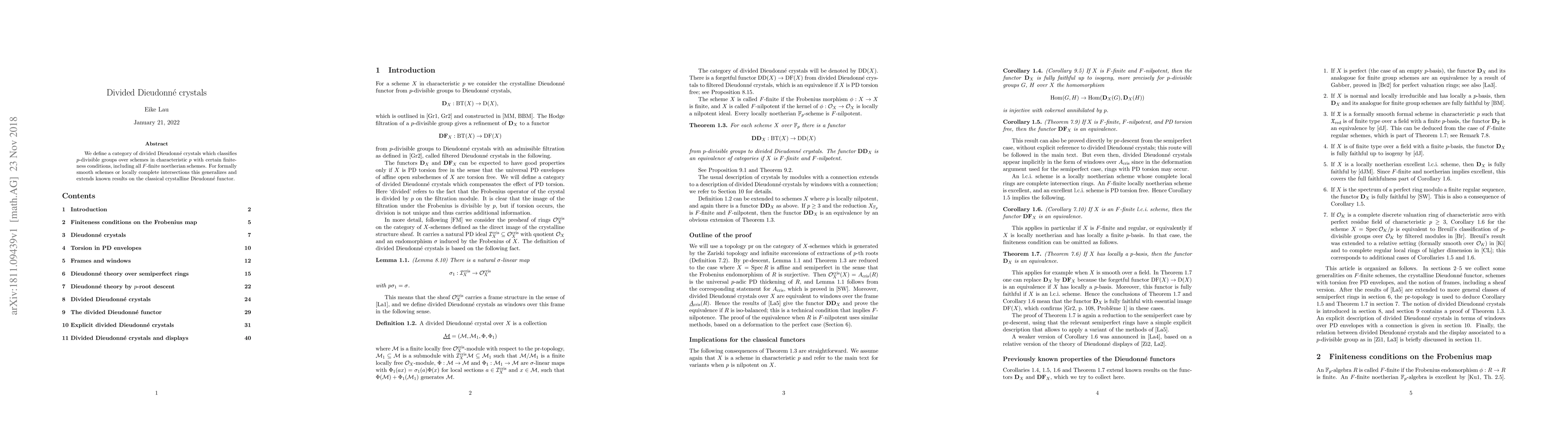 The paper defines a category of divided Dieudonnée crystals to classify p-divisible groups over F-finite noetherian schemes, extending classical crystalline Dieudonnée functor results for formally smooth schemes and locally complete intersections.