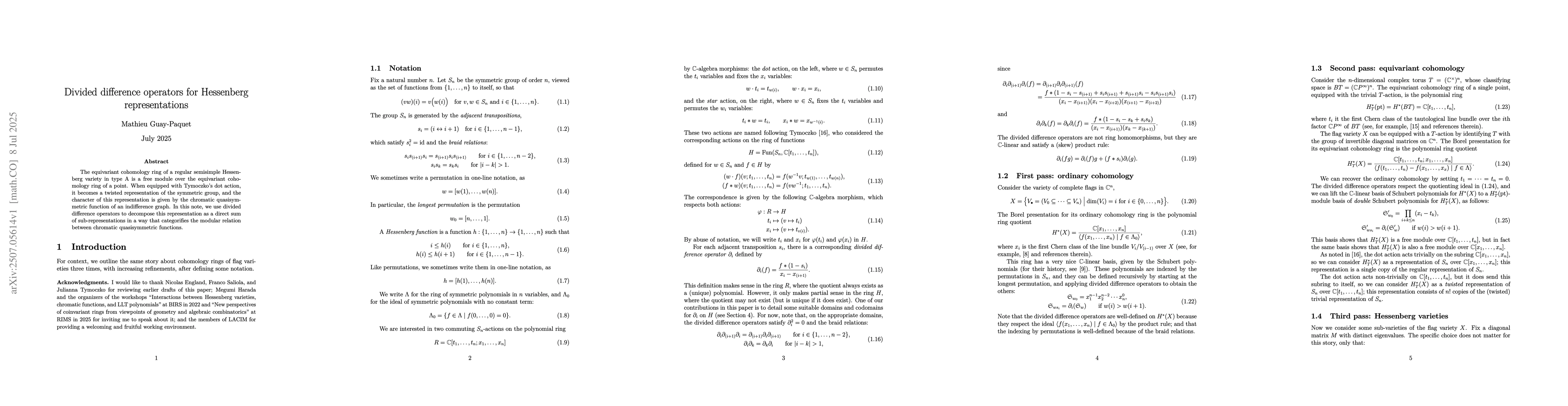 The equivariant cohomology ring of a regular semisimple Hessenberg variety in type A is a free module over the equivariant cohomology ring of a point. When equipped with Tymoczko's dot action, it becomes a twisted representation of the symmetric group, and the character of this representation is given by the chromatic quasisymmetric function of an indifference graph. In this note, we use divided difference operators to decompose this representation as a direct sum of sub-representations in a way that categorifies the modular relation between chromatic quasisymmetric functions.