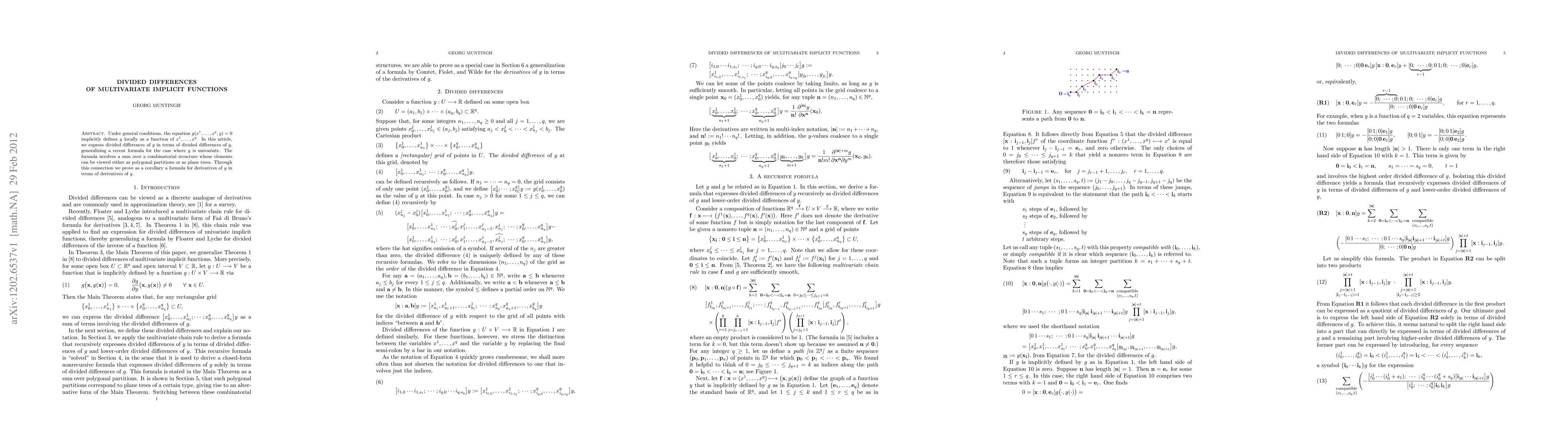 This paper generalizes the formula for divided differences of univariate functions to multivariate implicit functions, expressing divided differences of the implicit function $y$ in terms of those of $g$. It also derives a formula for derivatives of $y$ using derivatives of $g$, leveraging combinatorial structures like polygonal partitions and plane trees.