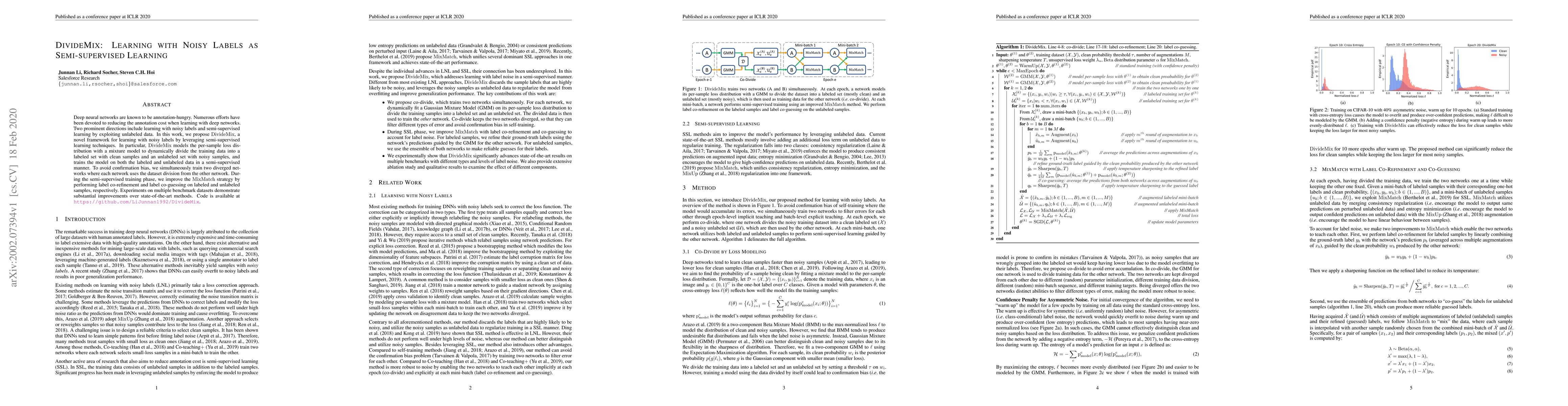 Deep neural networks are known to be annotation-hungry. Numerous efforts have been devoted to reducing the annotation cost when learning with deep networks. Two prominent directions include learning with noisy labels and semi-supervised learning by exploiting unlabeled data. In this work, we propose DivideMix, a novel framework for learning with noisy labels by leveraging semi-supervised learning techniques. In particular, DivideMix models the per-sample loss distribution with a mixture model to dynamically divide the training data into a labeled set with clean samples and an unlabeled set with noisy samples, and trains the model on both the labeled and unlabeled data in a semi-supervised manner. To avoid confirmation bias, we simultaneously train two diverged networks where each network uses the dataset division from the other network. During the semi-supervised training phase, we improve the MixMatch strategy by performing label co-refinement and label co-guessing on labeled and unlabeled samples, respectively. Experiments on multiple benchmark datasets demonstrate substantial improvements over state-of-the-art methods. Code is available at https://github.com/LiJunnan1992/DivideMix .