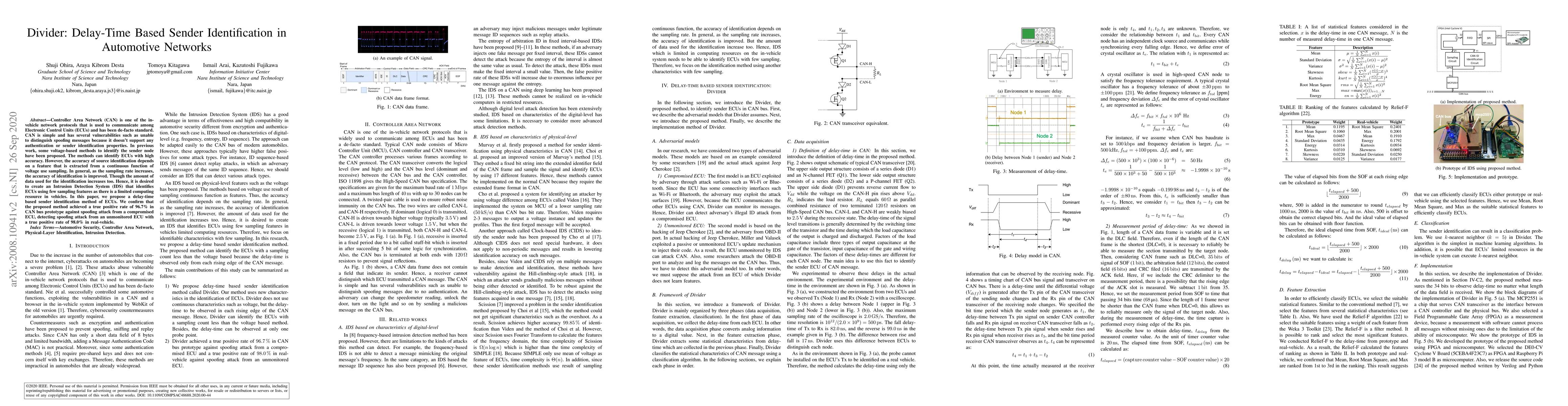 Controller Area Network (CAN) is one of the in-vehicle network protocols that is used to communicate among Electronic Control Units (ECUs) and has been de-facto standard. CAN is simple and has several vulnerabilities such as unable to distinguish spoofing messages because it does not support any authentication or sender identification properties. In previous work, some voltage-based methods to identify the sender node have been proposed. The methods can identify ECUs with high accuracy. However, the accuracy of source identification depends on a feature that is extracted from a continuous function of voltage use sampling. In general, as the sampling rate increases, the accuracy of identification is improved. Though the amount of data used for the identification increases too. Hence, it is desired to create an Intrusion Detection System (IDS) that identifies ECUs using few sampling features as there is a limited computing resource in vehicles. In this paper, we propose a delay-time based sender identification method of ECUs. We confirm that the proposed method achieved a true positive rate of 96.7% in CAN bus prototype against spoofing attack from a compromised ECU, detecting spoofing attack from an unmonitored ECU with a true positive rate of 98.0% in real-vehicle.