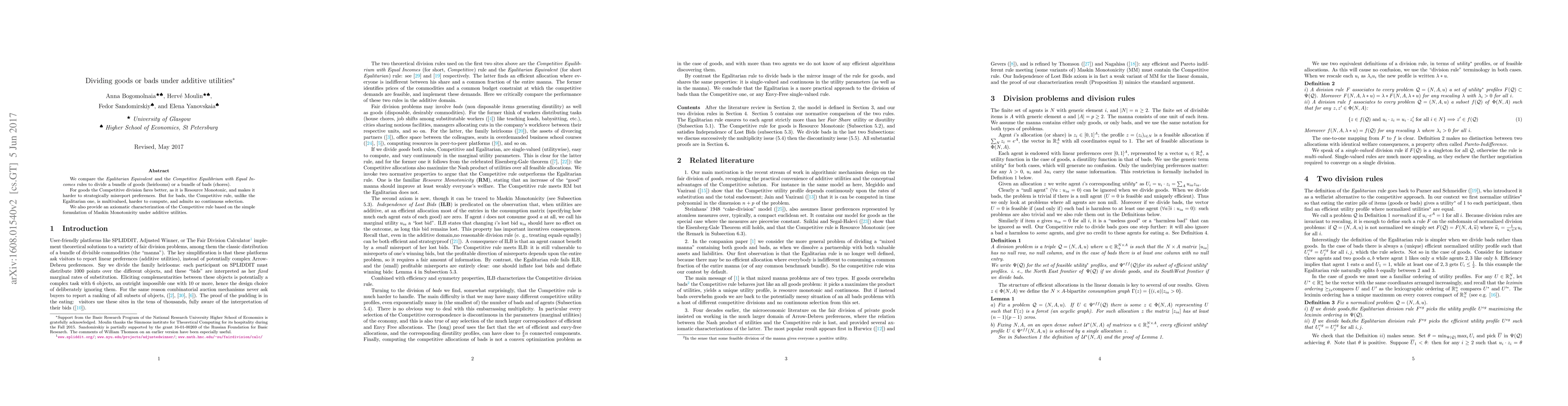 This paper compares the Egalitarian Equivalent and Competitive Equilibrium with Equal Incomes rules for dividing goods and bads. It finds that for goods, the Competitive rule is more favorable due to its resource monotonicity and reduced strategic misreporting, while for bads, the Competitive rule is multivalued, harder to compute, and lacks a continuous selection, unlike the Egalitarian rule.