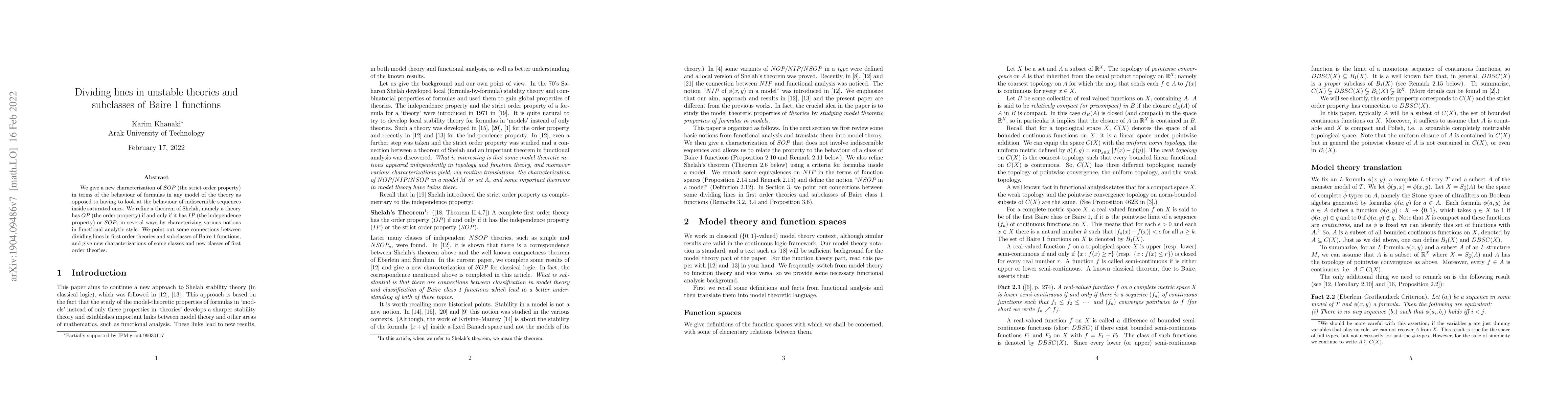 This paper provides a new characterization of the strict order property (SOP) in unstable theories, refining Shelah's theorem on the order property (OP). It also explores connections between dividing lines in first-order theories and subclasses of Baire 1 functions, introducing new characterizations for certain classes of first-order theories.
