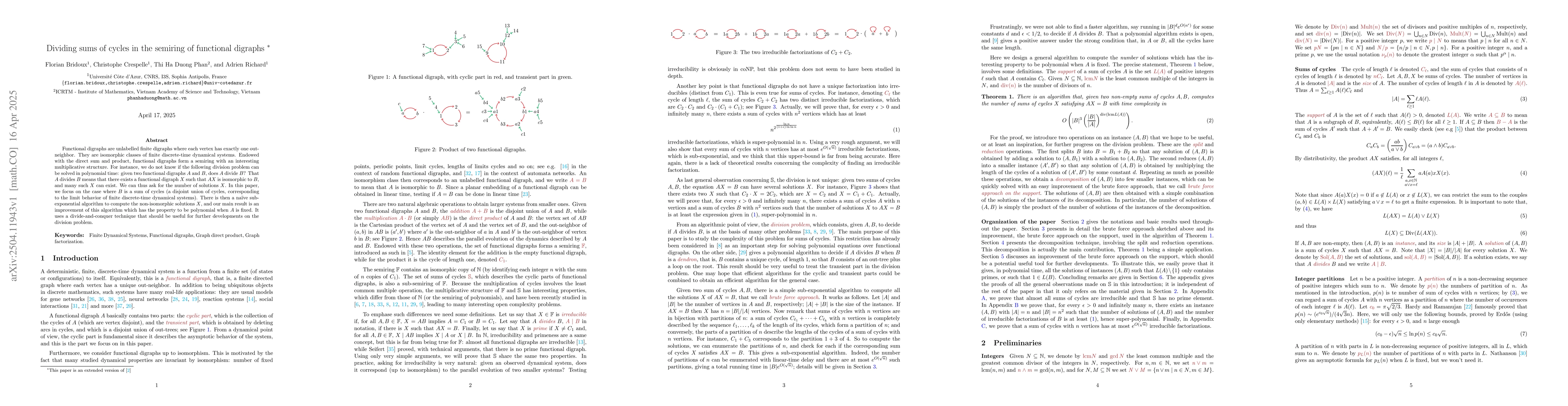 The paper investigates the division problem for sums of cycles in the semiring of functional digraphs, focusing on cases where B is a sum of cycles, corresponding to limit behaviors of finite discrete-time dynamical systems.
