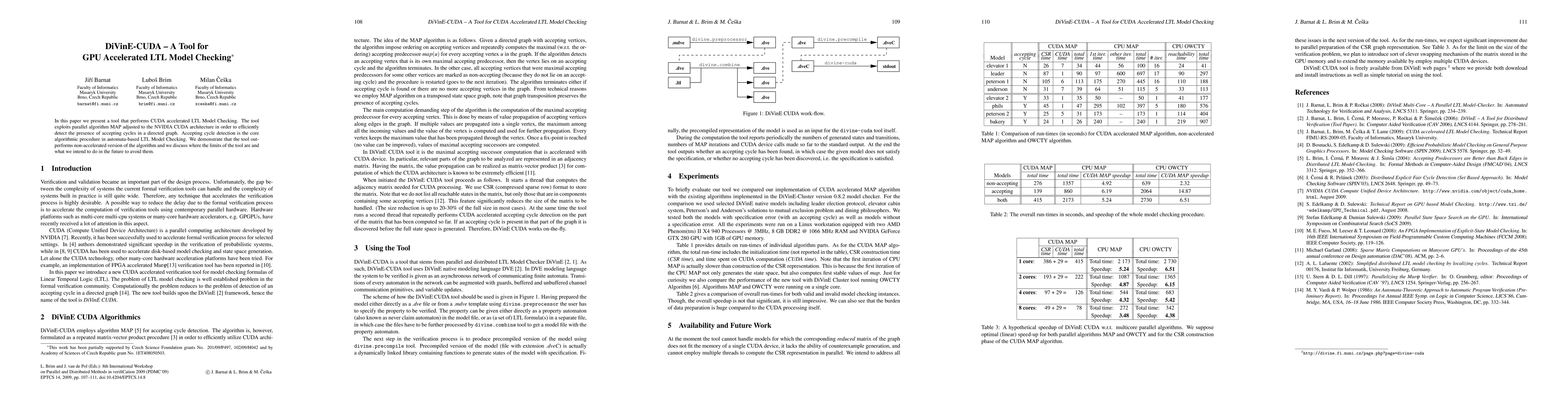 DiVinE-CUDA is a tool leveraging GPU acceleration via CUDA to enhance Linear Temporal Logic (LTL) Model Checking. It employs a parallelized MAP algorithm to efficiently identify accepting cycles in directed graphs, significantly outperforming traditional methods.