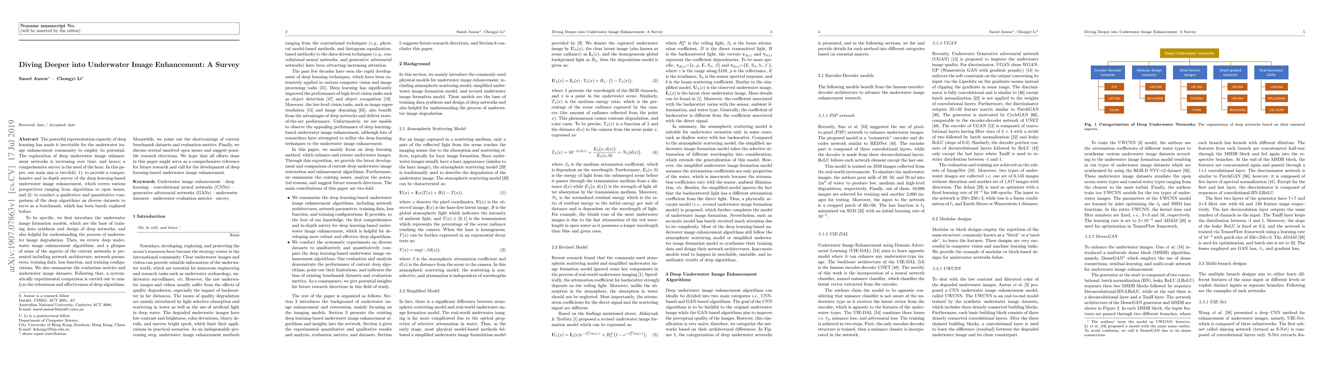 This paper provides a comprehensive survey of deep learning techniques for underwater image enhancement, reviewing algorithms, network architectures, and evaluation metrics. It also conducts a comparative analysis of these algorithms on various datasets, highlighting current shortcomings and proposing future research directions.