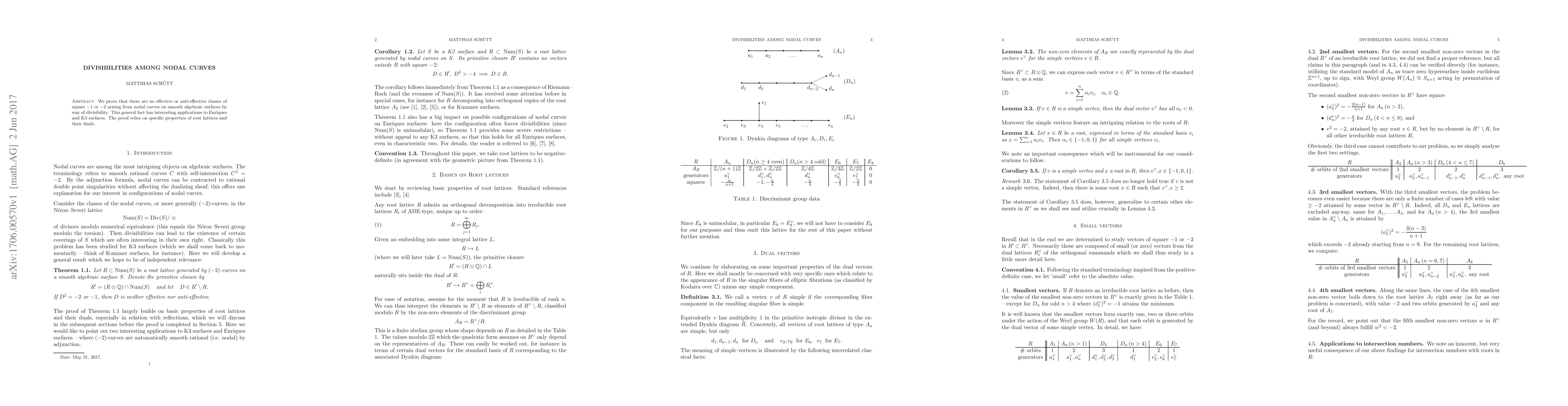 We prove that there are no effective or anti-effective classes of square -1 or -2 arising from nodal curves on smooth algebraic surfaces by way of divisibility. This general fact has interesting applications to Enriques and K3 surfaces. The proof relies on specific properties of root lattices and their duals.
