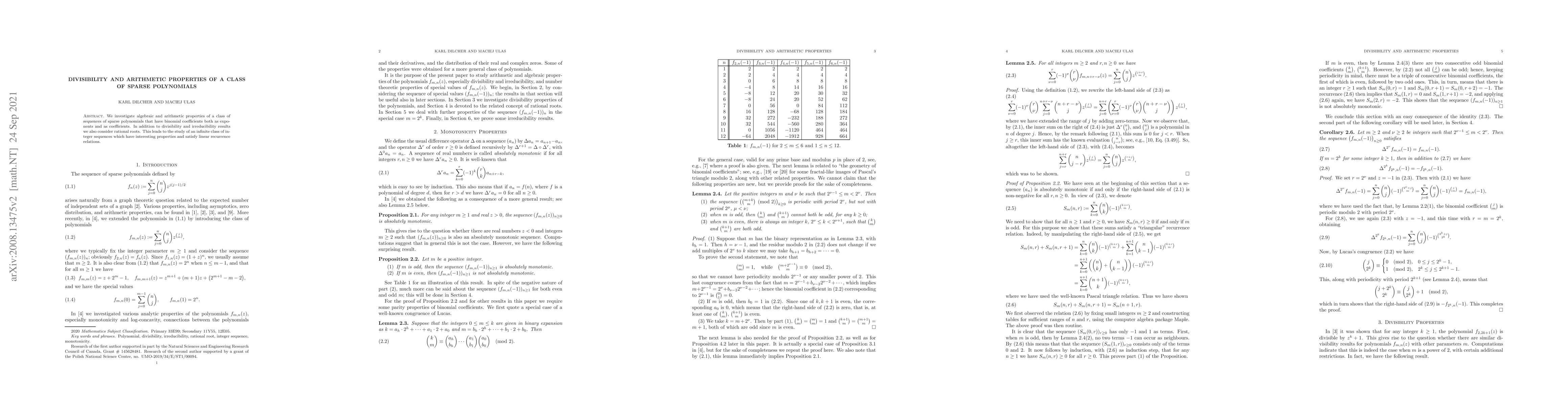 Summary: This paper explores the algebraic and arithmetic properties of sparse polynomials featuring binomial coefficients in both exponents and coefficients, focusing on divisibility, irreducibility, and rational roots, while also studying related integer sequences and their linear recurrence relations.