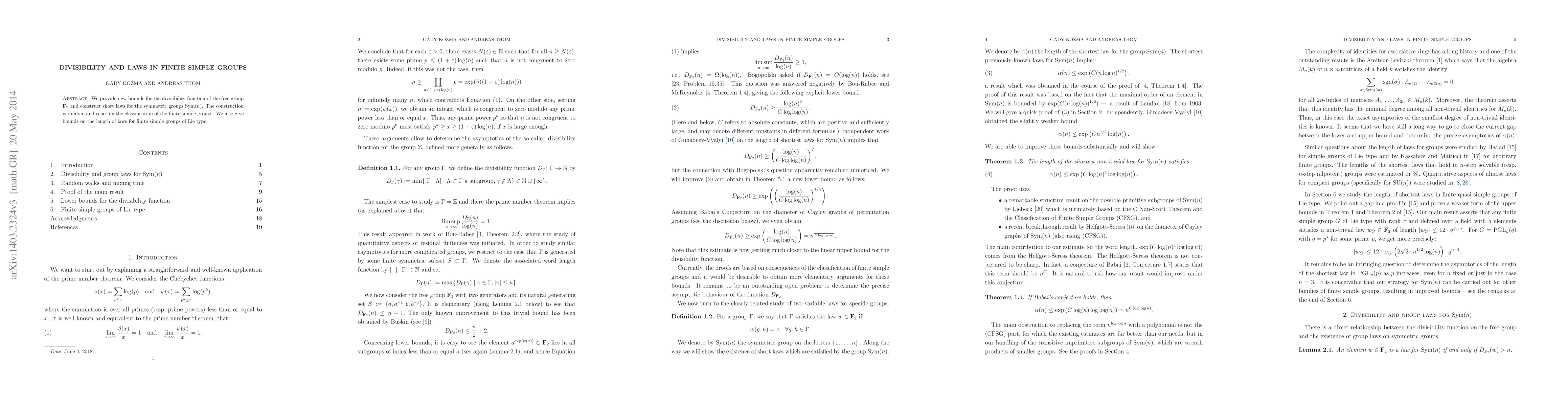 This paper establishes new bounds for the divisibility function in the free group F_2 and constructs short laws for symmetric groups using a random method based on the classification of finite simple groups, also providing bounds for laws in finite simple groups of Lie type.