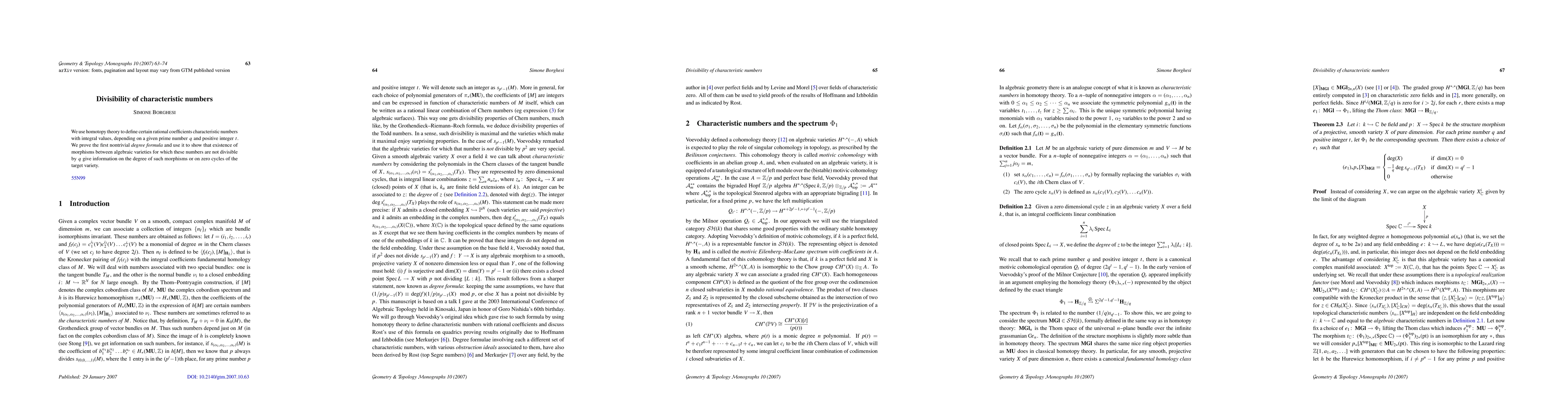 The paper defines integral characteristic numbers using homotopy theory and proves a nontrivial degree formula, showing that their non-divisibility by a prime q provides insights into the degree of morphisms between algebraic varieties or zero cycles in the target variety.