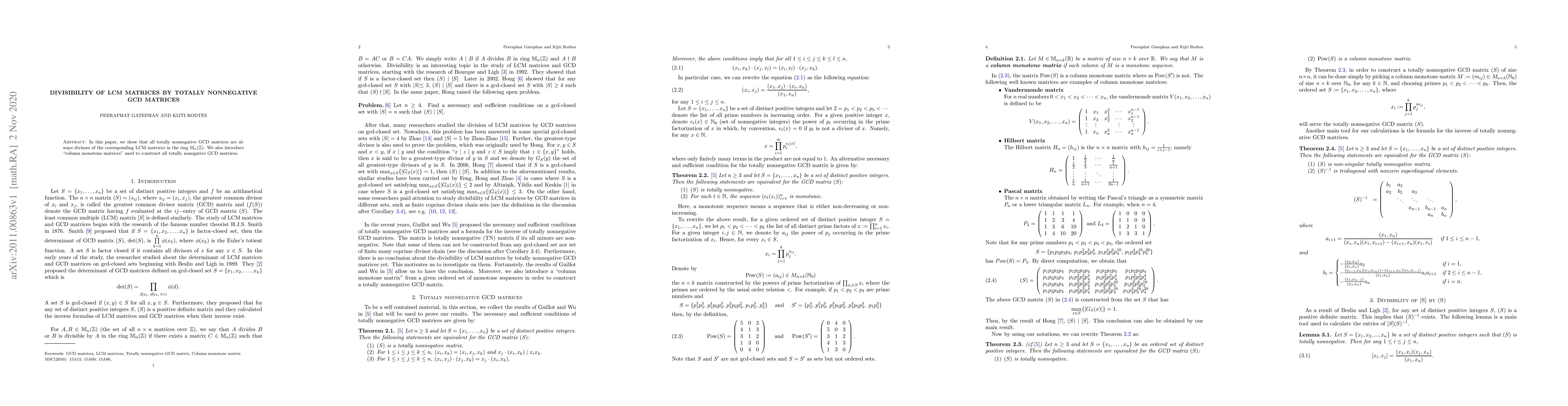 Summary: This paper demonstrates that totally nonnegative GCD matrices always divide corresponding LCM matrices in the ring $\mathbb{M}_{n}(\mathbb{Z})$, and introduces "column monotone matrices" as a construction method for these GCD matrices.
