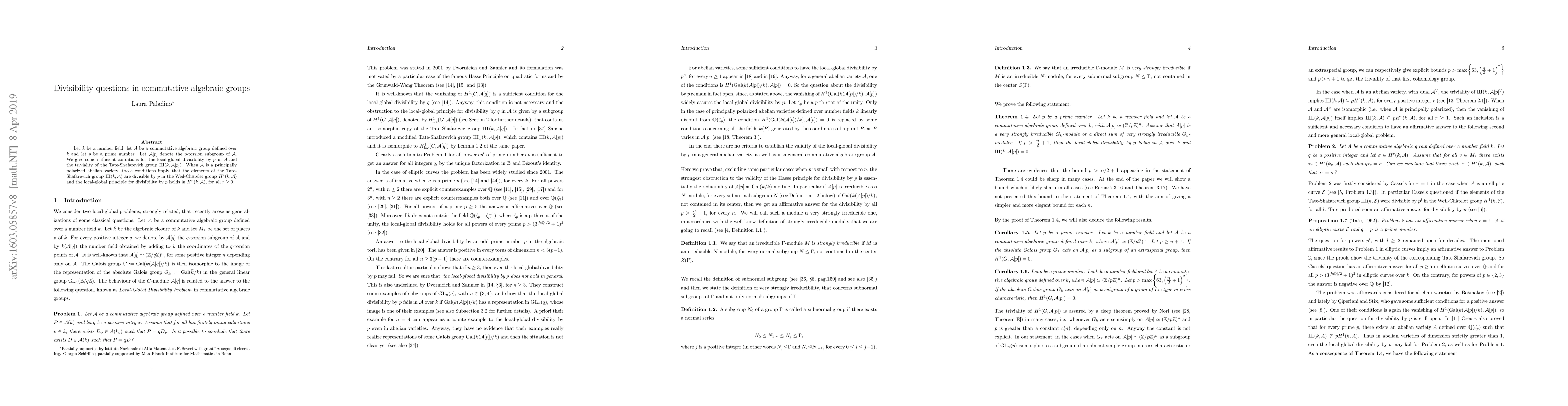 Let $k$ be a number field, let ${\mathcal{A}}$ be a commutative algebraic group defined over $k$ and let $p$ be a prime number. Let ${\mathcal{A}}[p]$ denote the $p$-torsion subgroup of ${\mathcal{A}}$. We give some sufficient conditions for the local-global divisibility by $p$ in ${\mathcal{A}}$ and the triviality of $Sha (k,{\mathcal{A}}[p])$. When ${\mathcal{A}}$ is an abelian variety principally polarized, those conditions imply that the elements of the Tate-Shafarevich group $Sha(k,{\mathcal{A}})$ are divisible by $p$ in the Weil-Ch\^atelet group $H^1(k,{\mathcal{A}})$ and the local-global principle for divisibility by $p$ holds in $H^r(k,{\mathcal{A}})$, for all $r\geq 0$.