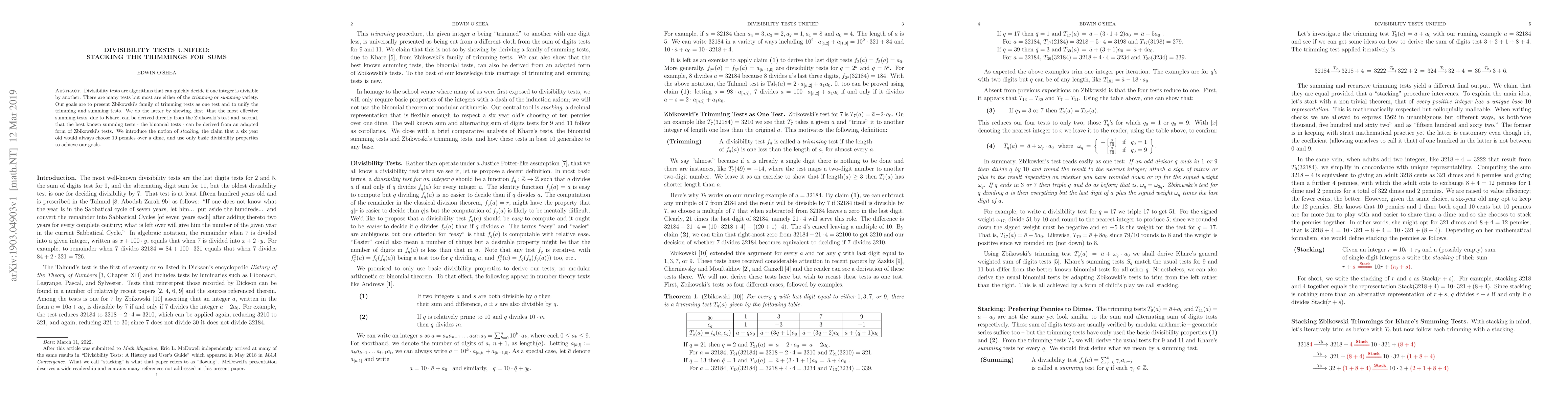 Divisibility tests are algorithms that can quickly decide if one integer is divisible by another. There are many tests but most are either of the trimming or summing variety. Our goals are to present Zbikowski's family of trimming tests as one test and to unify the trimming and summing tests. We do the latter by showing, first, that the most effective summing tests, due to Khare, can be derived directly from the Zbikowski's test and, second, that the best known summing tests - the binomial tests - can be derived from an adapted form of Zbikowski's tests. We introduce the notion of stacking, the claim that a six year old would always choose 10 pennies over a dime, and use only basic divisibility properties to achieve our goals.
