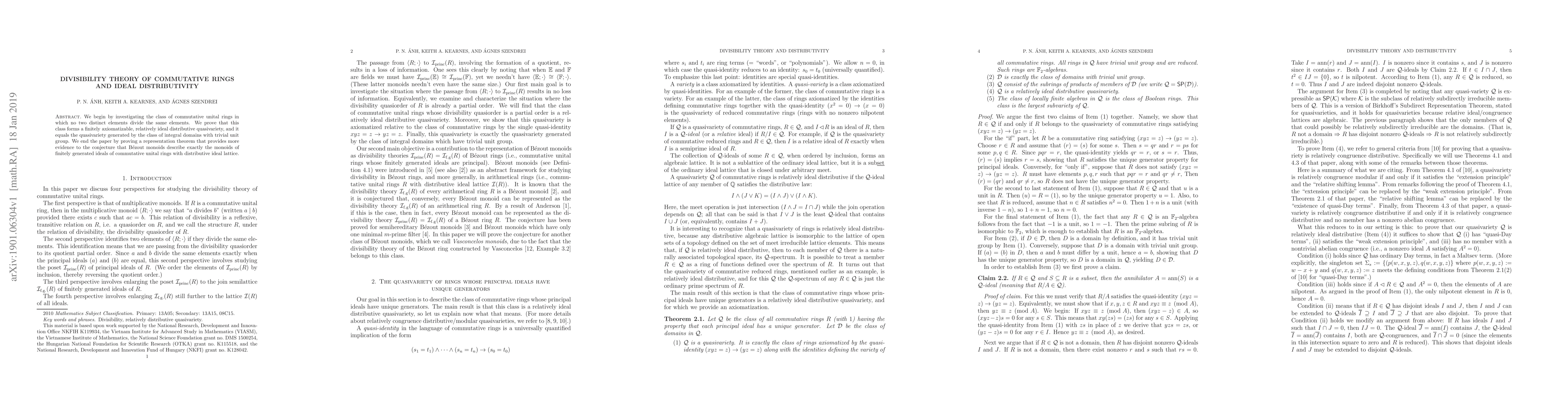 We begin by investigating the class of commutative unital rings in which no two distinct elements divide the same elements. We prove that this class forms a finitely axiomatizable, relatively ideal distributive quasivariety, and it equals the quasivariety generated by the class of integral domains with trivial unit group. We end the paper by proving a representation theorem that provides more evidence to the conjecture that B\'ezout monoids describe exactly the monoids of finitely generated ideals of commutative unital rings with distributive ideal lattice.