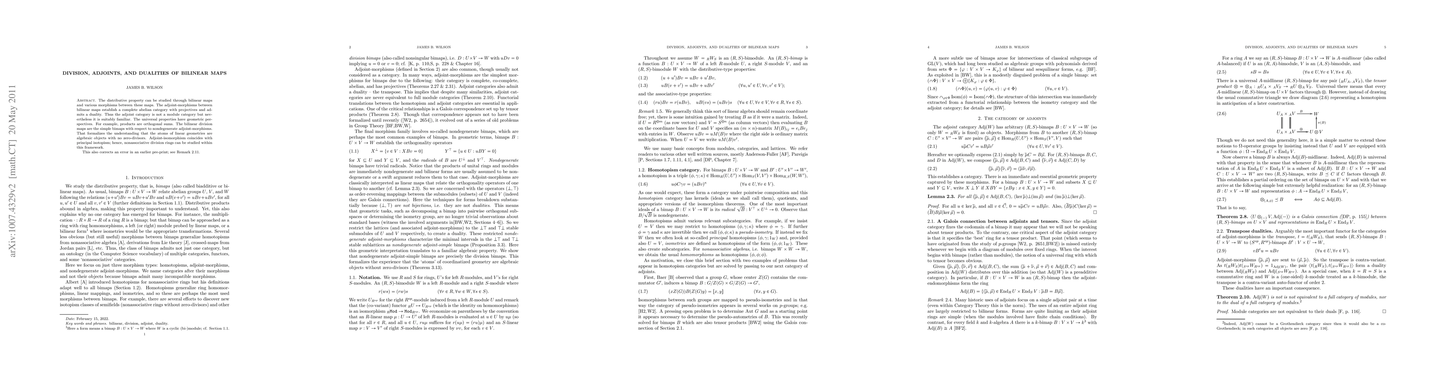 The work presents a novel perspective on bilinear maps by linking them to universal properties with geometric interpretations, and by formalizing division maps as simple bimaps with respect to nondegenerate adjoint-morphisms.
