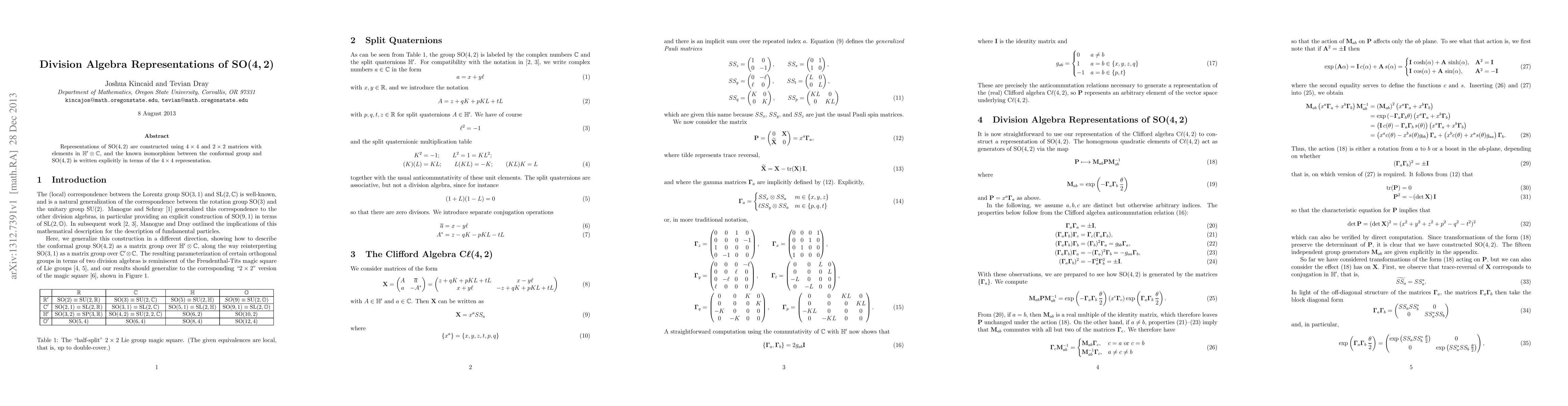 This paper constructs representations of $\text{SO}(4,2)$ using $4\times4$ and $2\times2$ matrices with elements in $\mathbb{H}'\otimes\mathbb{C}$, and explicitly details the isomorphism between the conformal group and $\text{SO}(4,2)$ via the $4\times4$ representation.