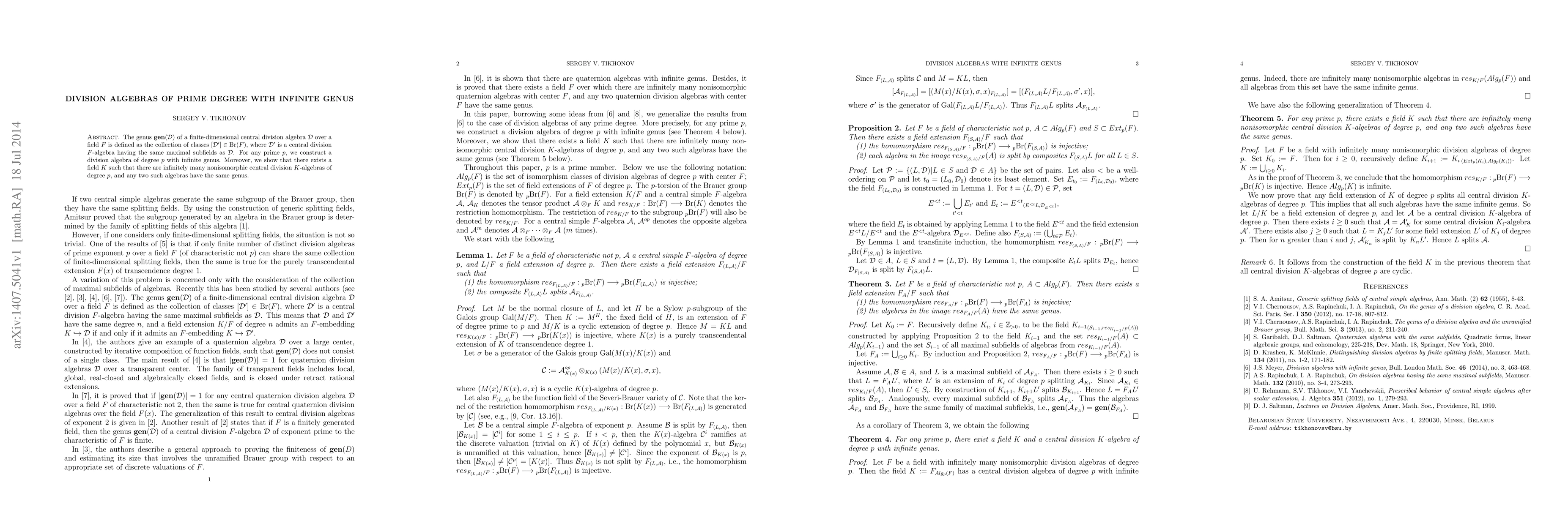 This paper constructs a finite-dimensional central division algebra of prime degree p with infinite genus, demonstrating the existence of infinitely many nonisomorphic such algebras over a field K, all sharing the same genus.