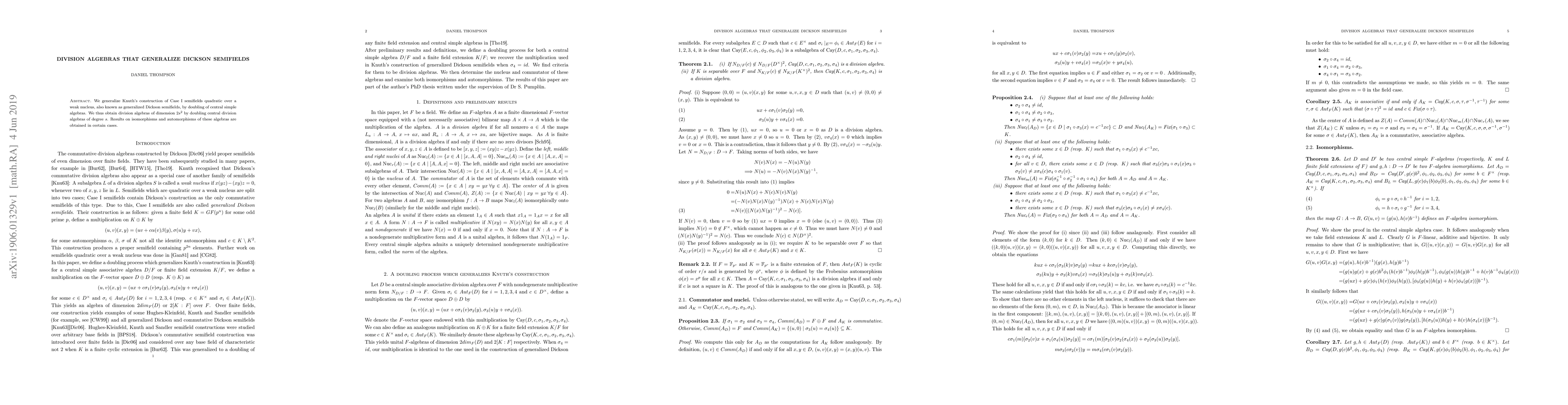 We generalize Knuth's construction of Case I semifields quadratic over a weak nucleus, also known as generalized Dickson semifields, by doubling of central simple algebras. We thus obtain division algebras of dimension $2s^2$ by doubling central division algebras of degree $s$. Results on isomorphisms and automorphisms of these algebras are obtained in certain cases.
