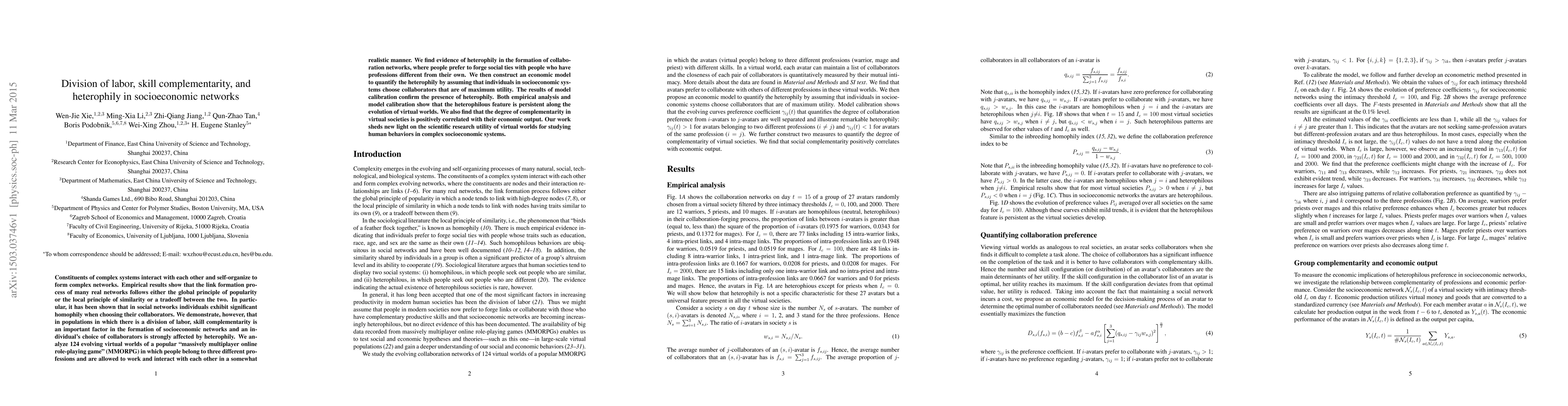 Constituents of complex systems interact with each other and self-organize to form complex networks. Empirical results show that the link formation process of many real networks follows either the global principle of popularity or the local principle of similarity or a tradeoff between the two. In particular, it has been shown that in social networks individuals exhibit significant homophily when choosing their collaborators. We demonstrate, however, that in populations in which there is a division of labor, skill complementarity is an important factor in the formation of socioeconomic networks and an individual's choice of collaborators is strongly affected by heterophily. We analyze 124 evolving virtual worlds of a popular "massively multiplayer online role-playing game" (MMORPG) in which people belong to three different professions and are allowed to work and interact with each other in a somewhat realistic manner. We find evidence of heterophily in the formation of collaboration networks, where people prefer to forge social ties with people who have professions different from their own. We then construct an economic model to quantify the heterophily by assuming that individuals in socioeconomic systems choose collaborators that are of maximum utility. The results of model calibration confirm the presence of heterophily. Both empirical analysis and model calibration show that the heterophilous feature is persistent along the evolution of virtual worlds. We also find that the degree of complementarity in virtual societies is positively correlated with their economic output. Our work sheds new light on the scientific research utility of virtual worlds for studying human behaviors in complex socioeconomic systems.