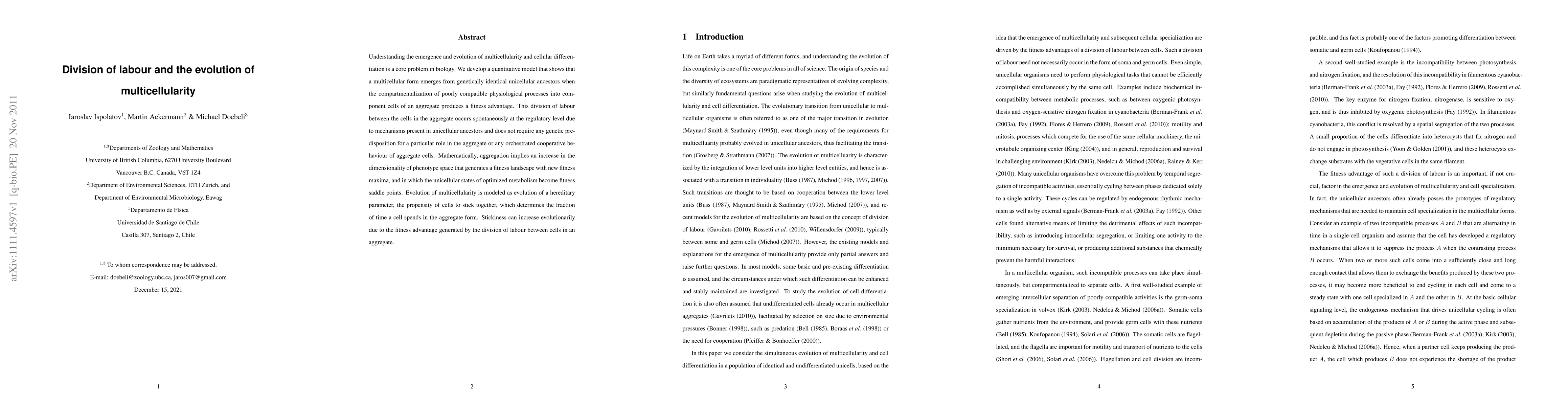 This paper develops a quantitative model demonstrating that multicellularity evolves from unicellular ancestors through the division of labour, where compartmentalization of incompatible physiological processes into separate cells yields a fitness advantage. The model shows that this division of labour occurs spontaneously without genetic predisposition, driven by an increase in phenotype space dimensionality that creates new fitness maxima.