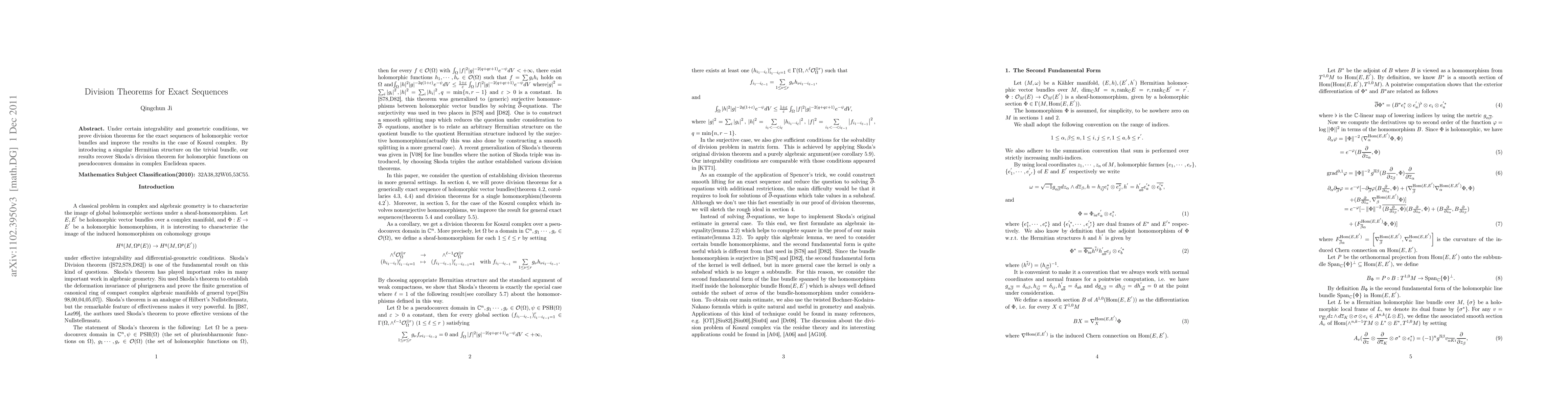 This paper proves division theorems for exact sequences of holomorphic vector bundles under specific integrability and geometric conditions, enhancing results for the Koszul complex. It introduces a singular Hermitian structure to recover Skoda's division theorem for holomorphic functions on pseudoconvex domains in complex Euclidean spaces.