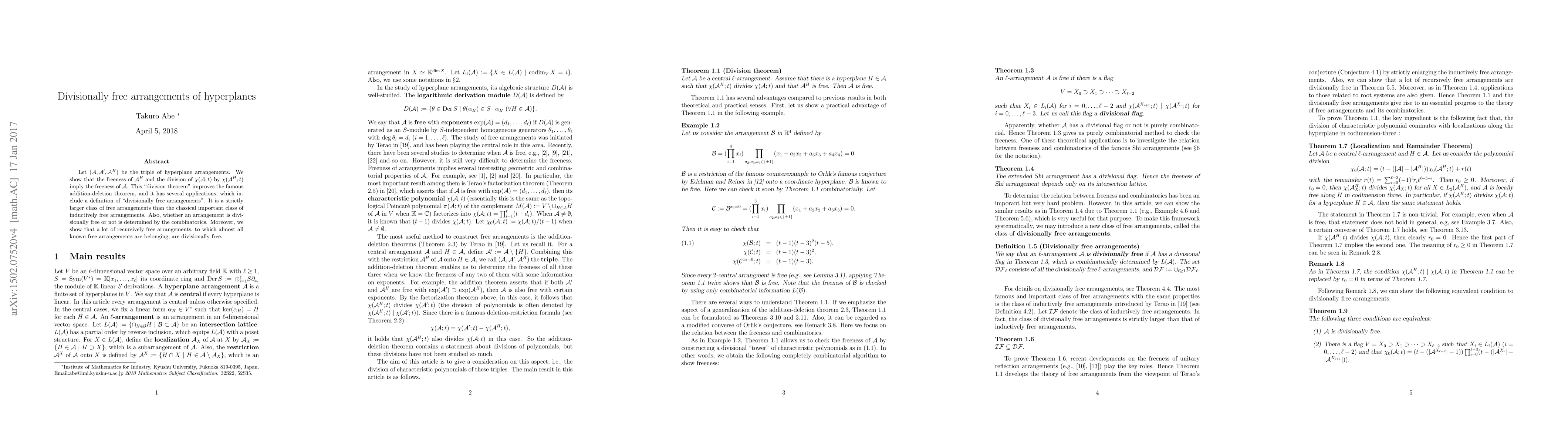 This paper investigates hyperplane arrangements and their characteristic polynomials, proving that the division of $\chi(\mathcal{A};t)$ by $\chi(\mathcal{A}^H;t)$ confirms the freeness of $\mathcal{A}$. It introduces the concept of "divisionally free arrangements," which includes arrangements that are strictly larger than those that are inductively free, and confirms Terao's conjecture within this larger set.