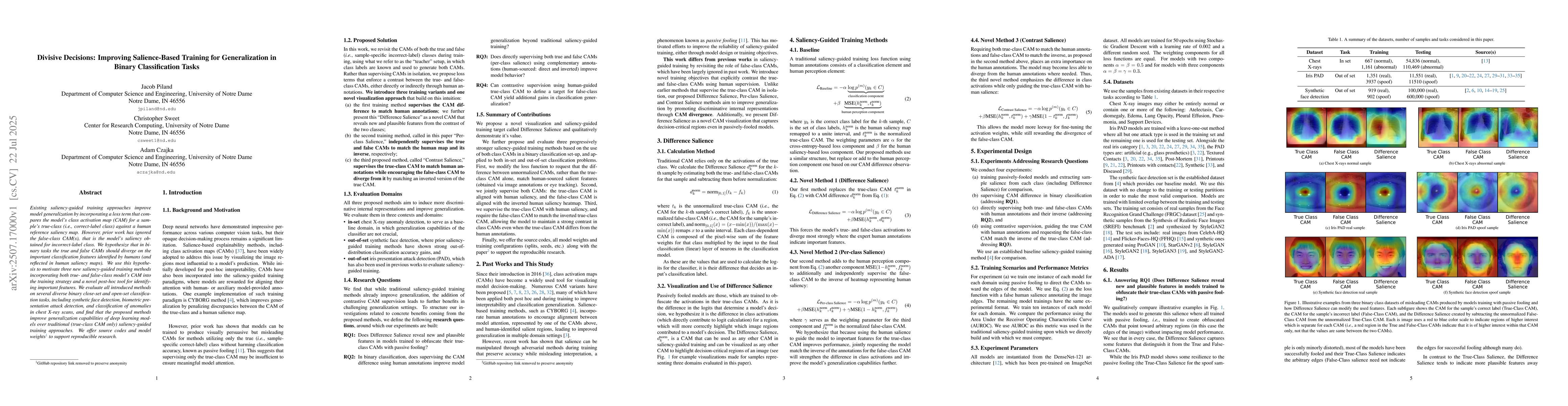 Existing saliency-guided training approaches improve model generalization by incorporating a loss term that compares the model's class activation map (CAM) for a sample's true-class ({\it i.e.}, correct-label class) against a human reference saliency map. However, prior work has ignored the false-class CAM(s), that is the model's saliency obtained for incorrect-label class. We hypothesize that in binary tasks the true and false CAMs should diverge on the important classification features identified by humans (and reflected in human saliency maps). We use this hypothesis to motivate three new saliency-guided training methods incorporating both true- and false-class model's CAM into the training strategy and a novel post-hoc tool for identifying important features. We evaluate all introduced methods on several diverse binary close-set and open-set classification tasks, including synthetic face detection, biometric presentation attack detection, and classification of anomalies in chest X-ray scans, and find that the proposed methods improve generalization capabilities of deep learning models over traditional (true-class CAM only) saliency-guided training approaches. We offer source codes and model weights\footnote{GitHub repository link removed to preserve anonymity} to support reproducible research.