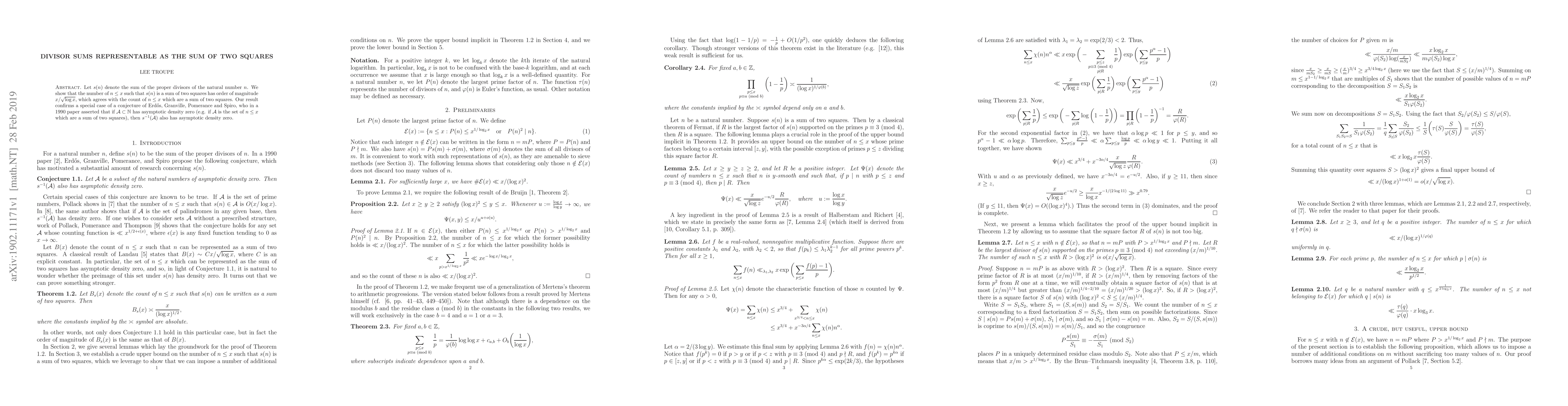 A research paper shows that a specific set of natural numbers has an asymptotic density zero, confirming a conjecture related to sums of two squares, with the number of such numbers having an order of magnitude of x/sqrt(log x).