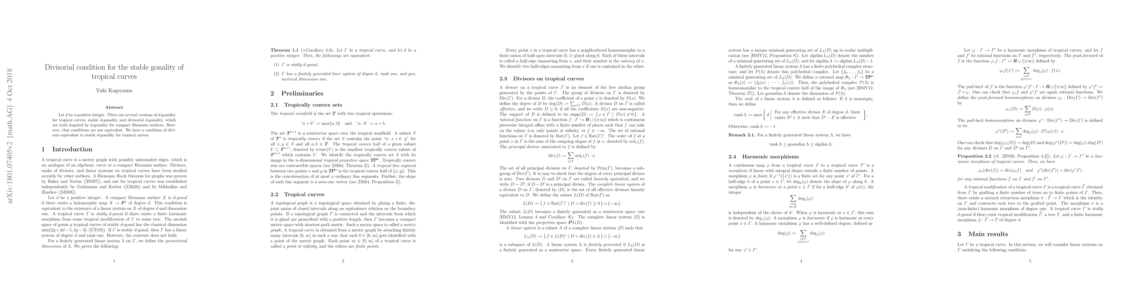 Let d be a positive integer. There are several versions of d-gonality for tropical curves, stable d-gonality and divisorial d-gonality, which are both inspired by d-gonality for compact Riemann surfaces. However, that conditions are not equivalent. We have a condition of divisors equivalent to stable d-gonality for tropical curves.