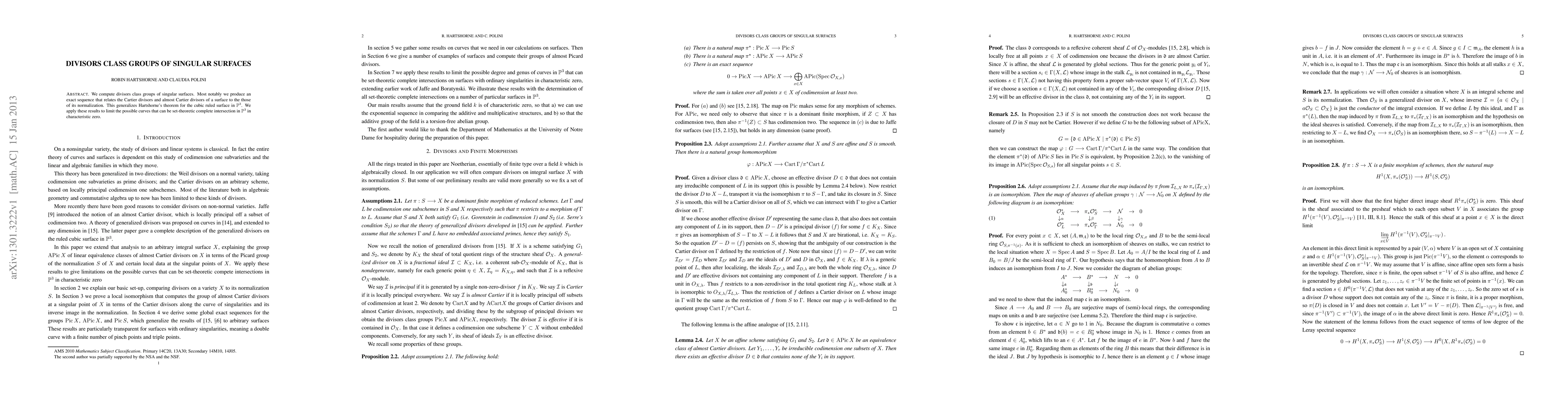 This paper computes divisor class groups of singular surfaces, establishing an exact sequence linking Cartier divisors and almost Cartier divisors to those of their normalization. It generalizes Hartshorne's theorem for cubic ruled surfaces and applies these results to restrict possible curves in P^3 that can be complete intersections in characteristic zero.