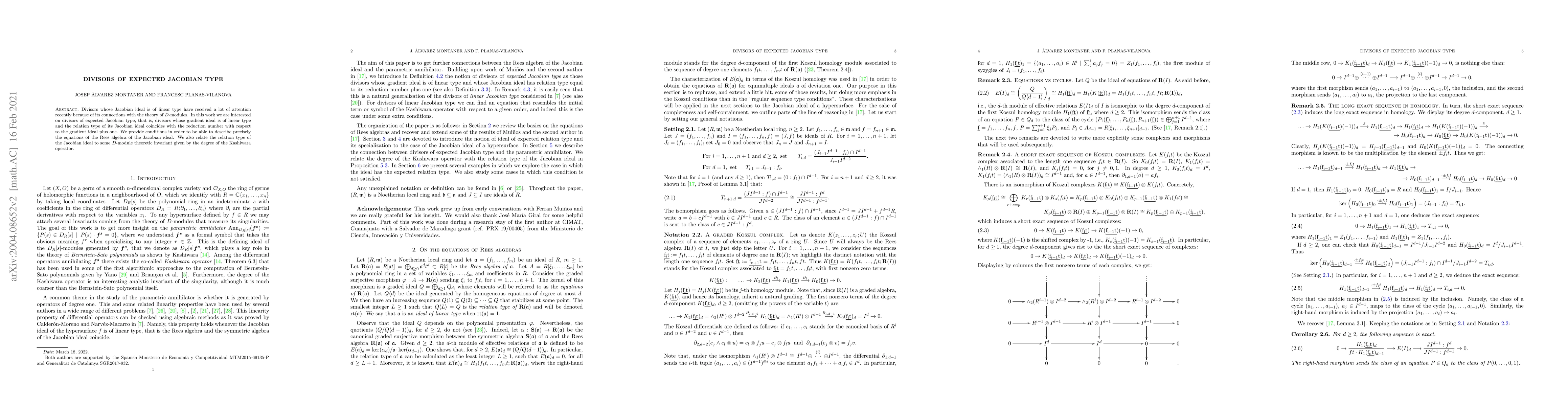 Divisors whose Jacobian ideal is of linear type have received a lot of attention recently because of its connections with the theory of D-modules. In this work we are interested on divisors of expected Jacobian type, that is, divisors whose gradient ideal is of linear type and the relation type of its Jacobian ideal coincides with the reduction number with respect to the gradient ideal plus one. We provide conditions in order to be able to describe precisely the equations of the Rees algebra of the Jacobian ideal. We also relate the relation type of the Jacobian ideal to some D-module theoretic invariant given by the degree of the Kashiwara operator.