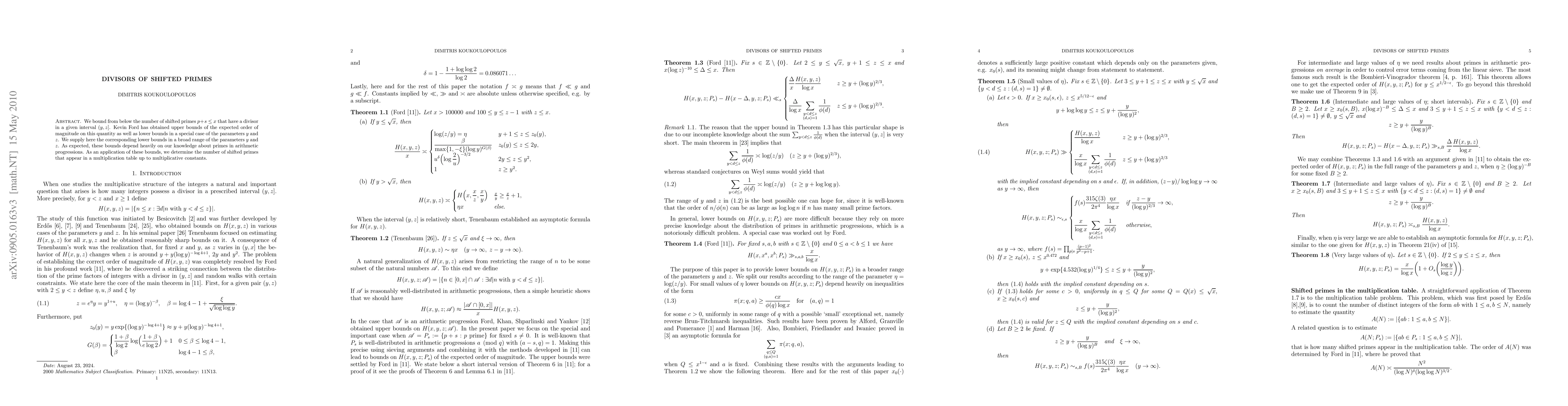 This paper establishes lower bounds for the number of shifted primes \( p+s < x \) that have divisors within a given interval \( (y, z] \), extending previous results by Kevin Ford. These bounds rely on knowledge of primes in arithmetic progressions and are applied to determine the count of shifted primes in multiplication tables.