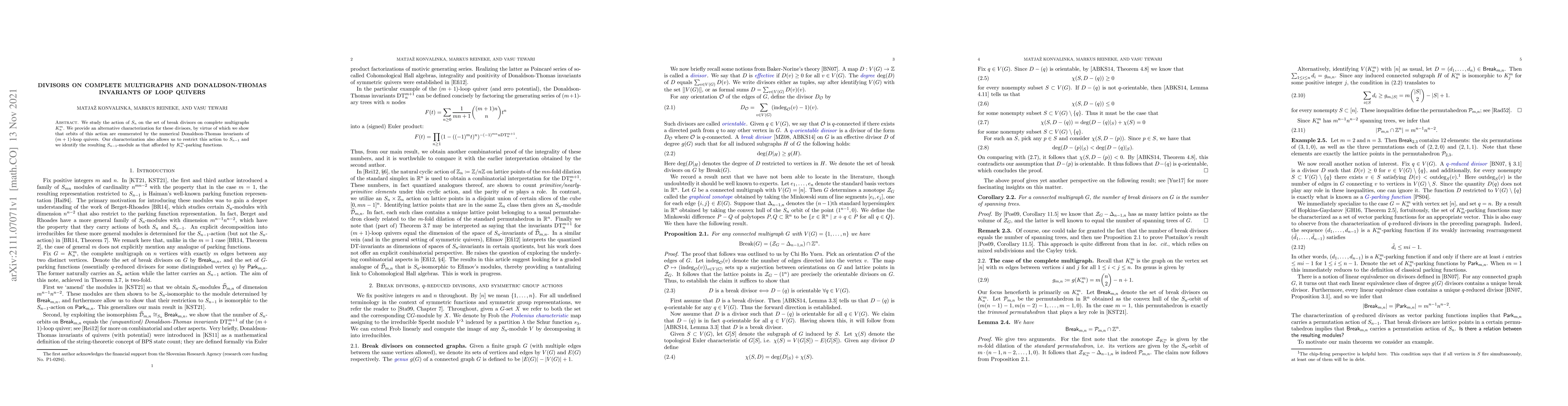 This paper studies divisors on complete multigraphs using Donaldson-Thomas invariants of loop quivers, finding an alternative characterization and connection to $S_n$ action.