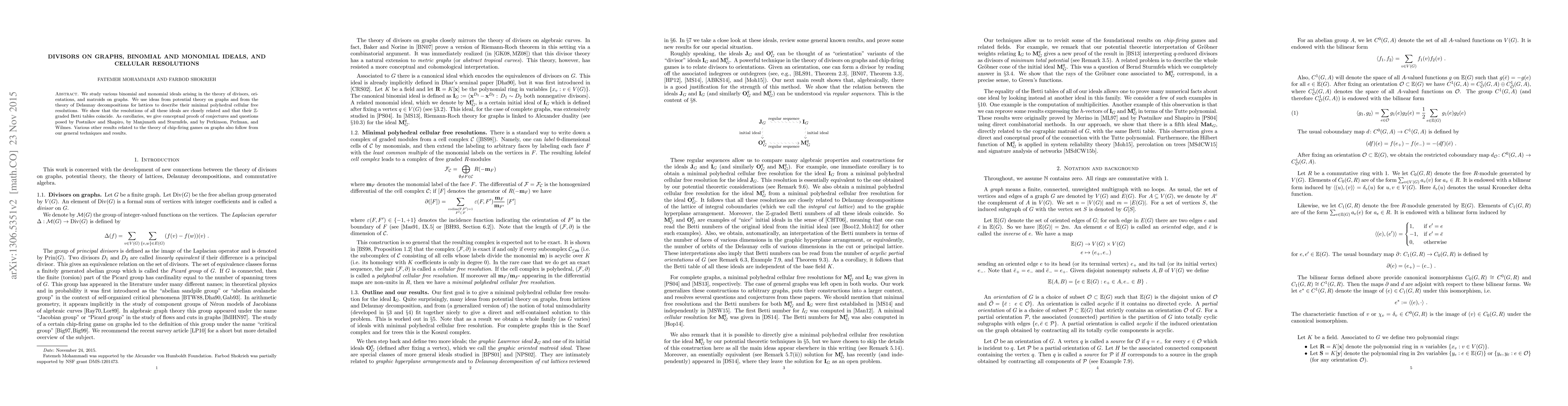 We study various binomial and monomial ideals arising in the theory of divisors, orientations, and matroids on graphs. We use ideas from potential theory on graphs and from the theory of Delaunay decompositions for lattices to describe their minimal polyhedral cellular free resolutions. We show that the resolutions of all these ideals are closely related and that their $\mathbb{Z}$-graded Betti tables coincide. As corollaries, we give conceptual proofs of conjectures and questions posed by Postnikov and Shapiro, by Manjunath and Sturmfels, and by Perkinson, Perlman, and Wilmes. Various other results related to the theory of chip-firing games on graphs also follow from our general techniques and results.