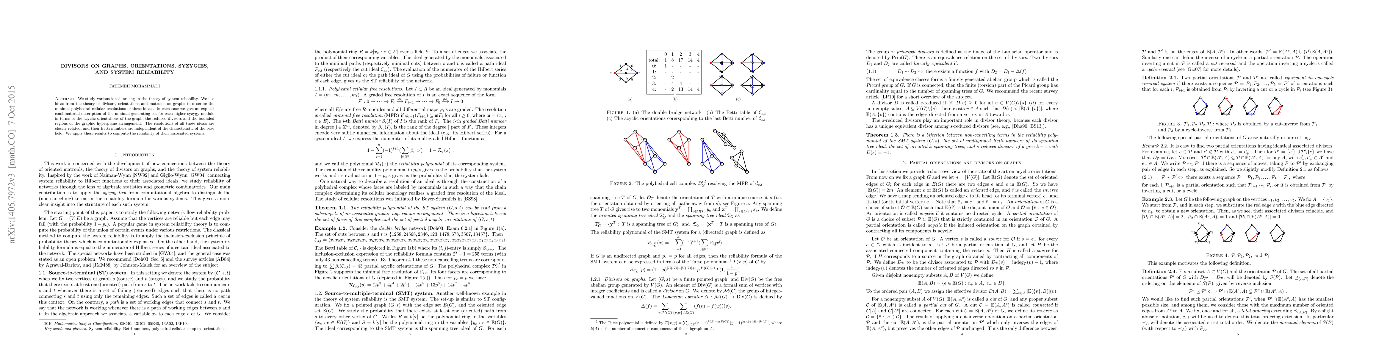 We study various ideals arising in the theory of system reliability. We use ideas from the theory of divisors, orientations and matroids on graphs to describe the minimal polyhedral cellular free resolutions of these ideals. In each case we give an explicit combinatorial description of the minimal generating set for each higher syzygy module in terms of the acyclic orientations of the graph, the $q$-reduced divisors and the bounded regions of the graphic hyperplane arrangement. The resolutions of all these ideals are closely related, and their Betti numbers are independent of the characteristic of the base field. We apply these results to compute the reliability of their associated coherent systems.