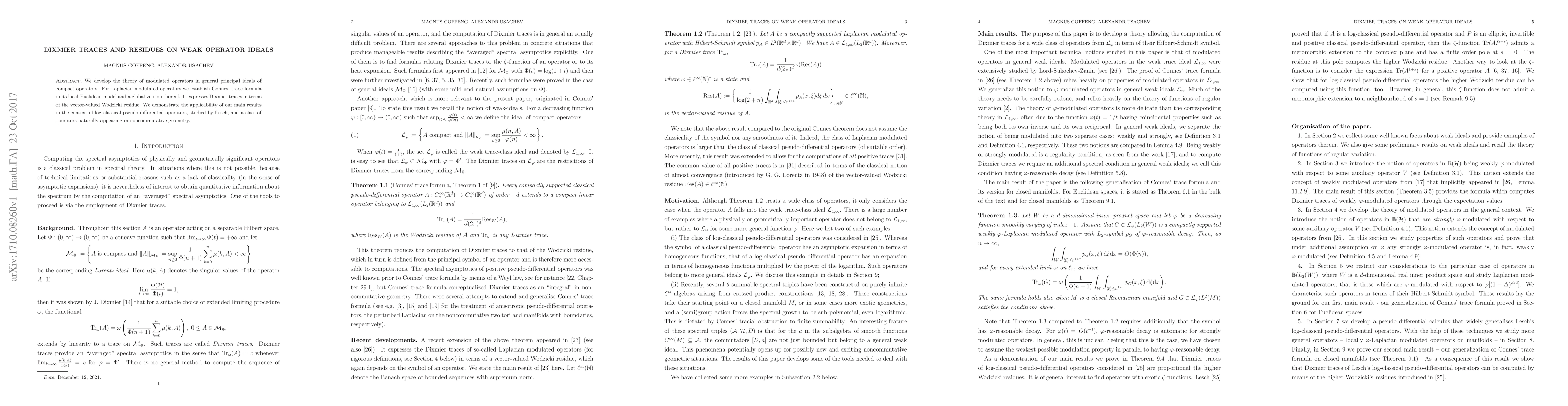 This paper develops the theory of modulated operators within principal ideals of compact operators, establishing Connes' trace formula for Laplacian modulated operators and linking Dixmier traces to the vector-valued Wodzicki residue. The results are applied to log-classical pseudo-differential operators and operators in noncommutative geometry.